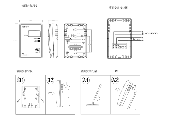 LCD 显示 | 绿色: CO 2 <1000ppm 良好 黄色: CO 2 >1000ppm 中度 红色: CO 2 >1400ppm 严重 两种模式可选: CO2 和 TVOC 都超过设置点