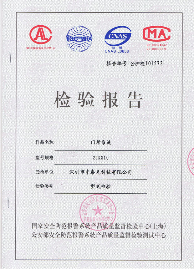 门禁检测证书
