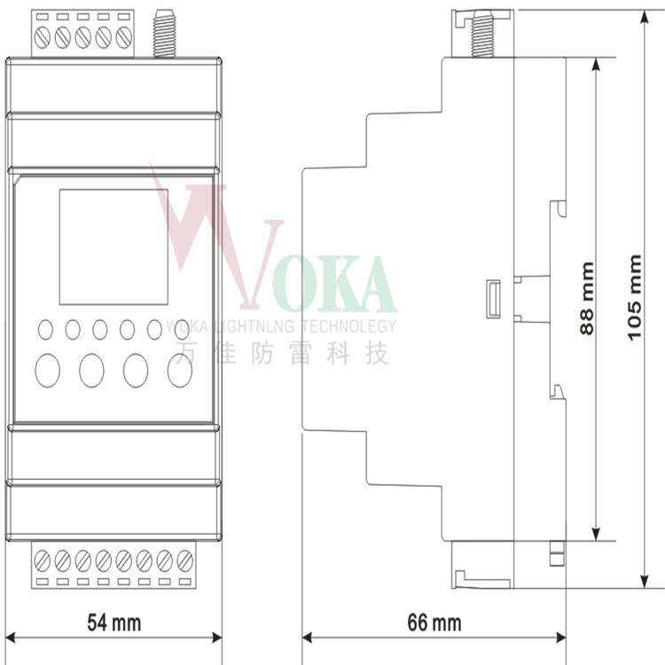 标准35mm导轨安装,54mm 宽度,0. 96英寸OLED显示屏,标准MODBUS-RTU 协议。4路开关量采集端口。