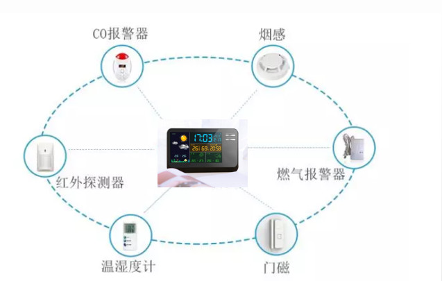 同时WiFi天气钟还具备报警主机功能,WiFi报警主机可在安防报警、视频监控、健康数据采集等领域广泛使用。在家居或店铺应用中,利用无线通信技术,通过WiFi报警主机能直接接入云指纹锁、门磁传感器、红外探测仪、燃气泄漏传感器、烟雾探测器、温湿度传感器等探头或终端设备,构建起安防报警系统,远程监控环境的安全数据。一旦警情发生,报警信息就会及时上传至云端并通过手机通知用户,还能联动摄像头实现自动抓拍等功能。