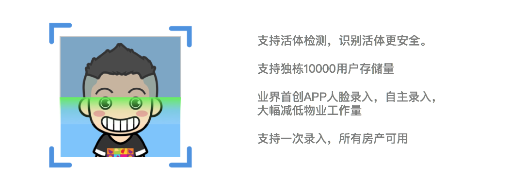 门口机开通人脸识别功能后,业主只需要登陆APP,点击“人脸识别开锁”选项,进行拍照即完成人脸录入,会用APP就会录入,简单编辑。之后只需要在门口机点击“开锁”,界面出现视频扫描框,根据指示将人脸移到指定框中即可进行人脸识别,识别率高达95%。