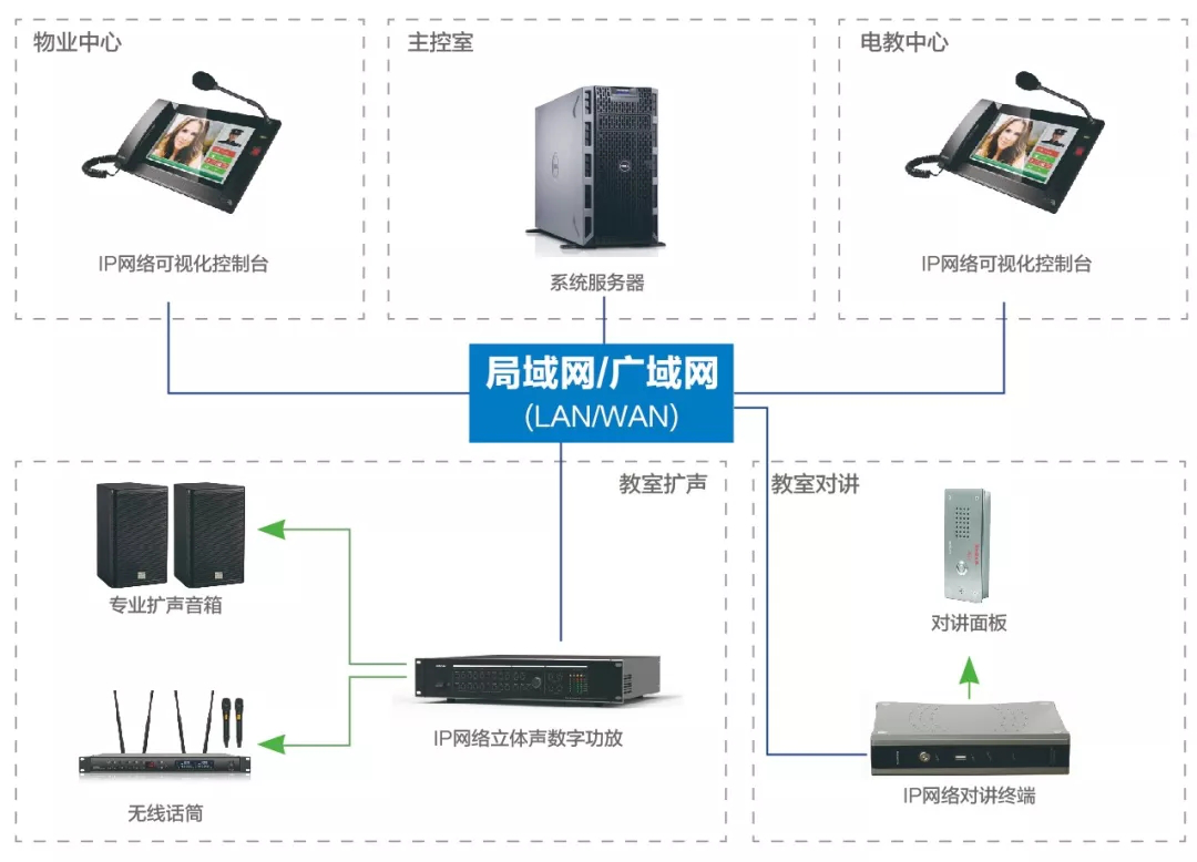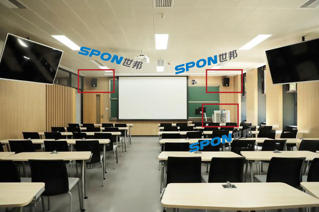 -世邦专业扩声音箱部署地点在黑板左右两边;-世邦IP网络功放部署在教室机柜;-专业级扩声音箱,满足一些重视音质的课程和讲座的声场效果需求。