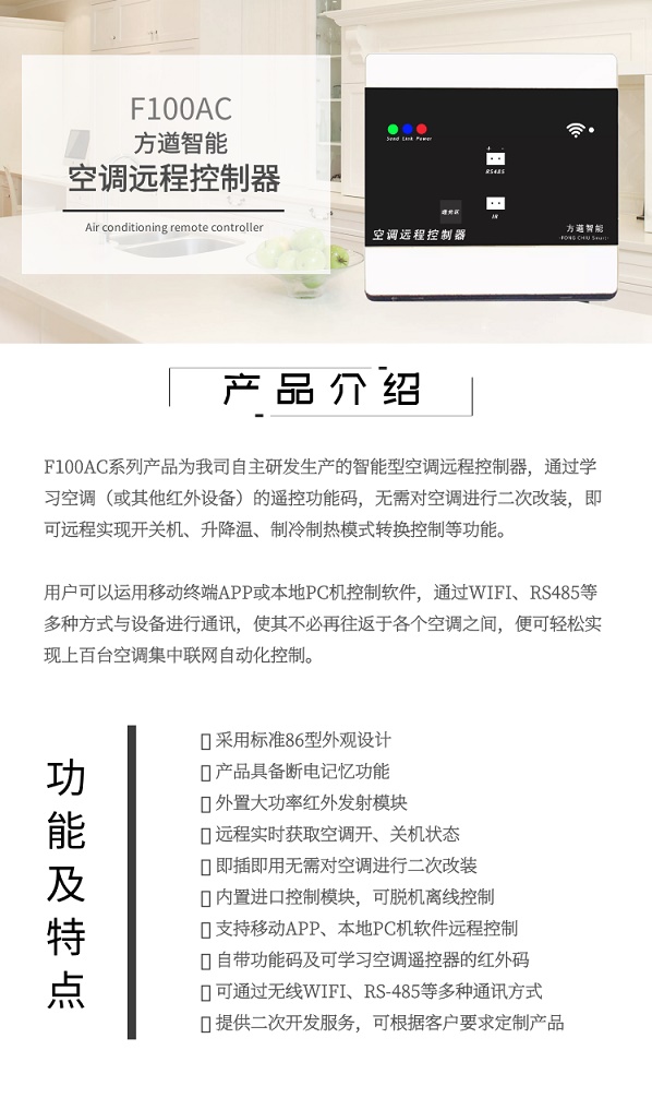 F100AC系列产品为我司自主研发生产的智能型空调远程控制器,通过学习空调(或其他红外设备)的遥控功能码,无需对空调进行二次改装,即可远程实现开关机、升降温、制冷制热模式转换控制等功能。