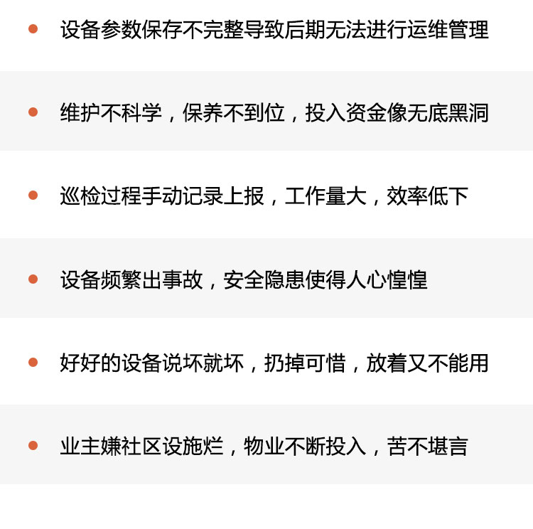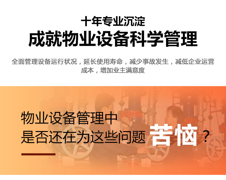 万城互联设施设备管理系统,全面管理物业社区所有设施设备情况和运行状态,系统通过建立完善的台账,运行过程的管理、运行数据记录,故障管理、维护管理等,确保设施设备处于好的运行状态,减少设施设备重大事故发生,延长设施设备使用寿命,从而降低企业管理运营成本。