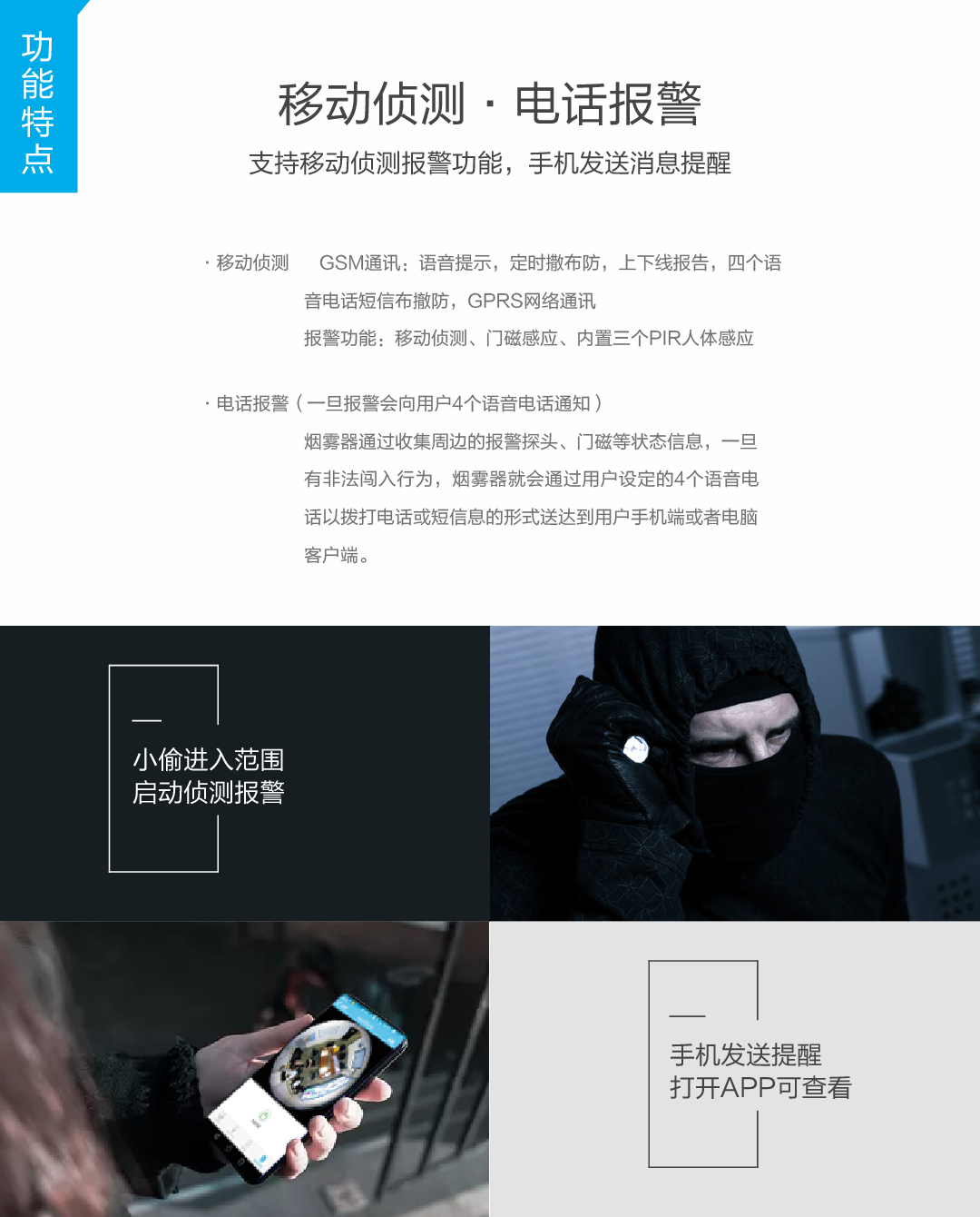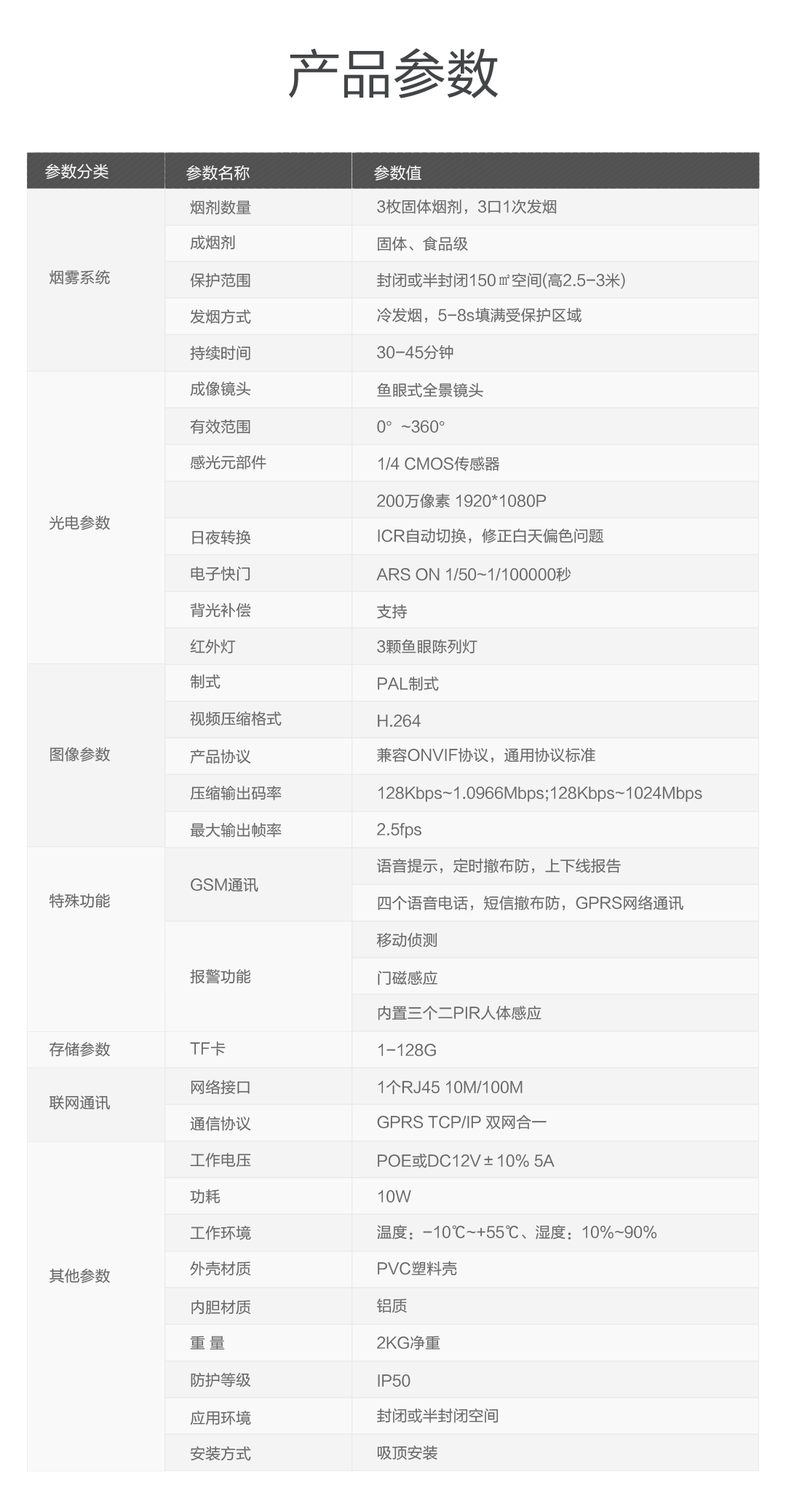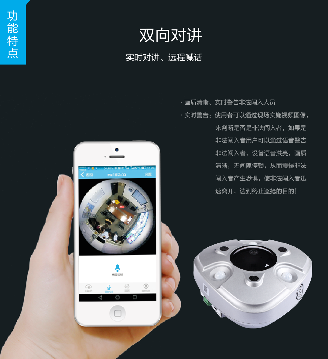 主要功能:视频监控+视频录像+云存储+报警联动+短信提示+语音对讲+烟雾弹+远程控制