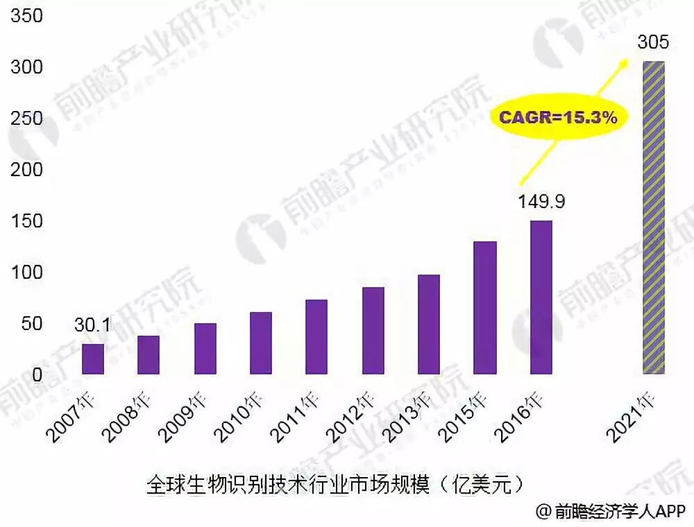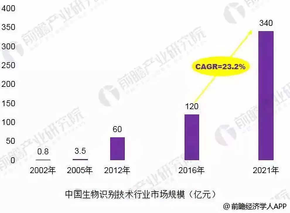 而中国的生物特征识别市场规模也保持高速增长。2002至2015年,国内生物识别市场的年复合增长率达到50%,2016年生物识别市场规模达到120亿元左右。预计到2021年,中国生物识别行业的市场规模将突破340亿元。