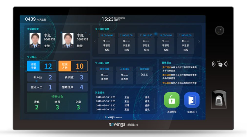 监舍信息显示及查询系统是通过监舍室外信息显示终端与监狱业务平台联网组成的监舍信息显示及查询系统,通常安装在监舍门口,可实时动态显示当前监舍负责民警以及服刑人员的基本信息、在监情况、谈话情况等信息,同时可以通过触摸屏实现信息的采集和查询。
