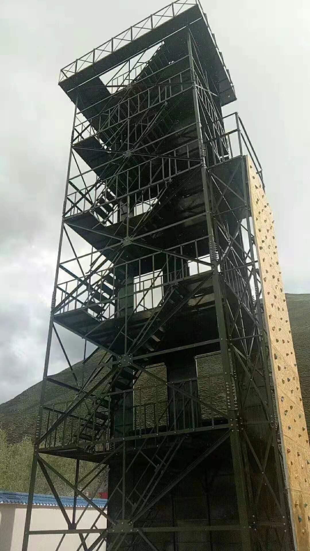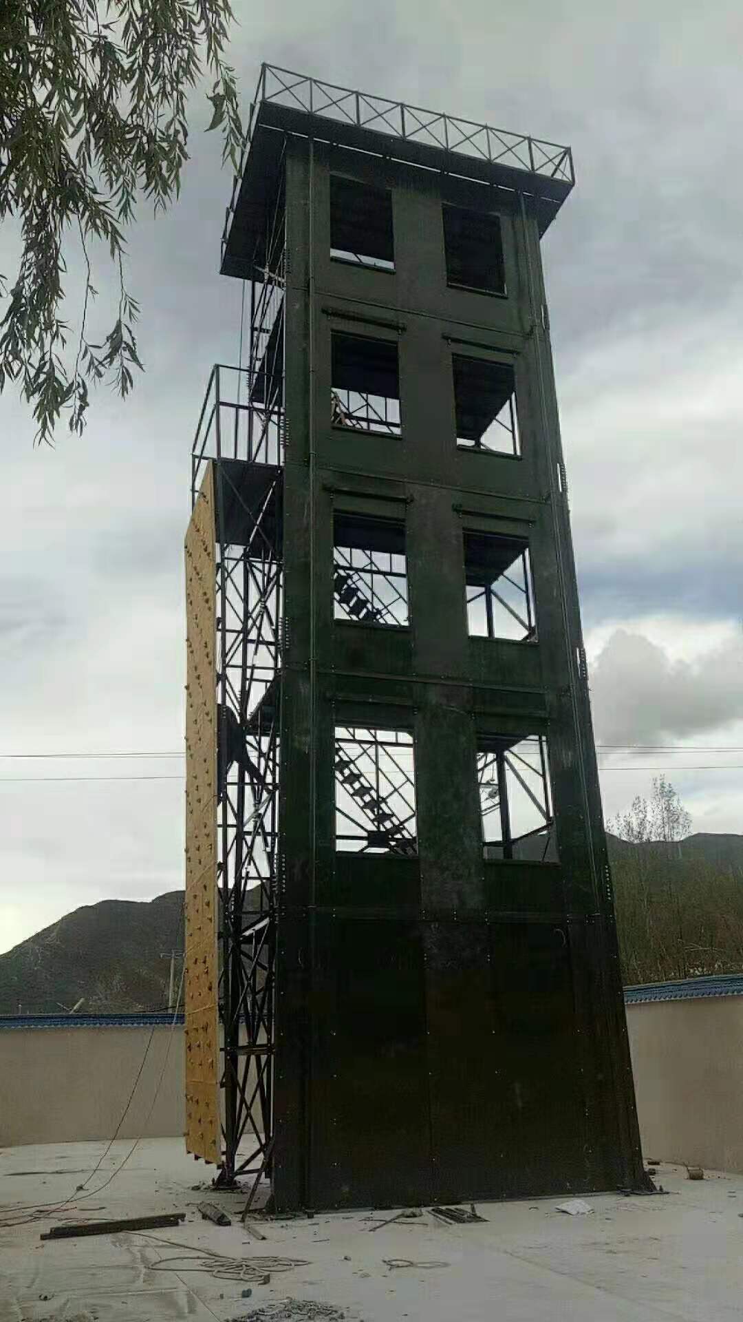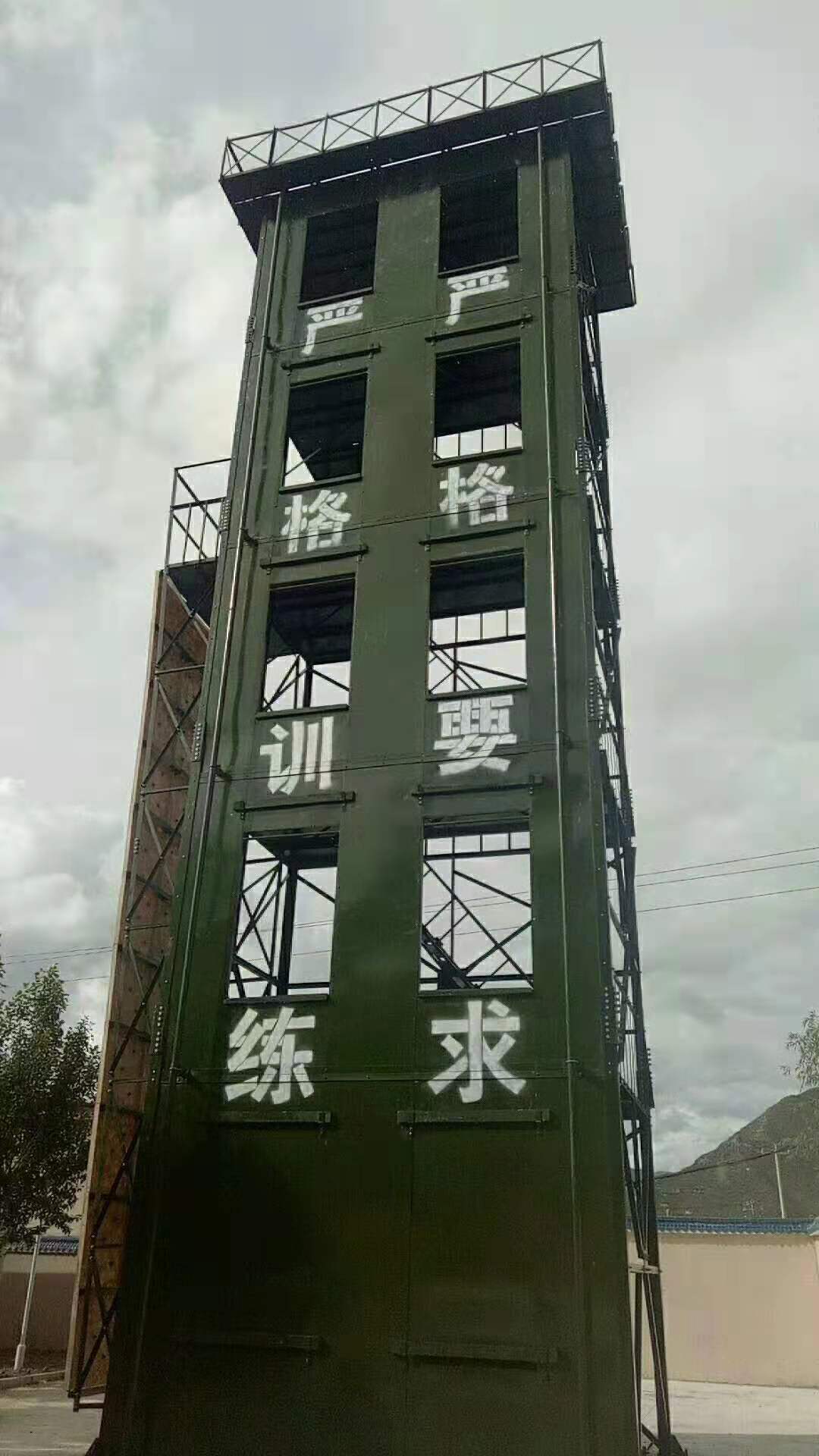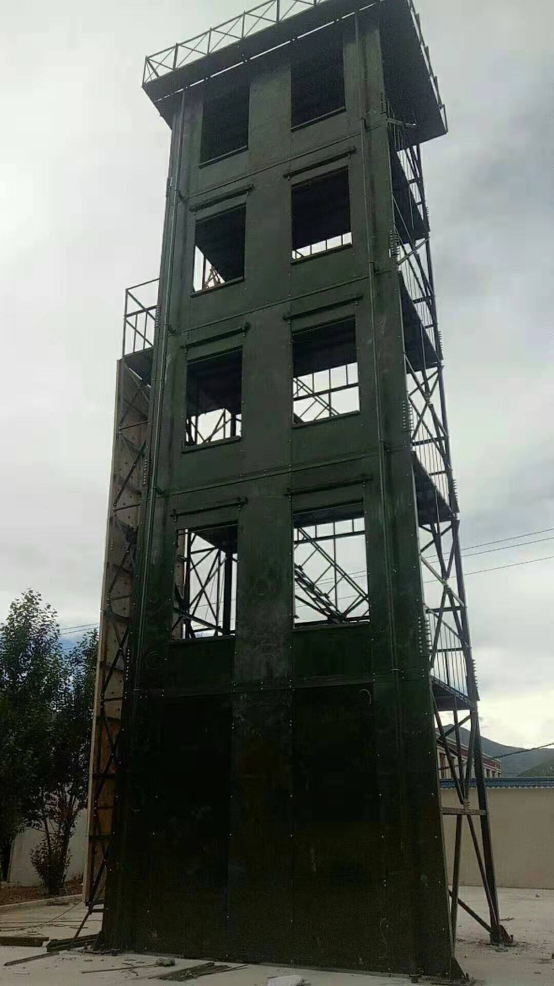 六、训练塔宜设置室外消防梯。消防梯应通至塔顶,并宜离地面3米高处设起,宽度不宜小于50厘米。)消防训练塔产品说明:多功能消防训练塔,主要由(1)模拟窗、(2)楼层隔板、(3)后骨架、(4)了望、指挥平台骨架及主体钢结构框架等组成。在塔体前端部位设有八个模拟窗(根据需要定做几层几窗口),在上、下相邻的模拟窗之间设有楼层隔板(钢板)。2、在塔体后部下方设有与模拟窗相对应的后骨架。3、模拟窗与楼层隔板以及后骨架及主体框架相互之间用螺栓连接为一体,4、层与层之间均有安全楼梯连接。5、塔体上部装有了望、指挥平台。6、根据需要可安装测风仪、凉水带架和警报器等。7、根据需要,在消防训练塔旁边可制作模拟消防训练井。8、消防训练塔设备同时还配备消防专用滑轮、滑竿、模拟墙等附属设施。本训练塔结构科学、操作安全、使用方便,产品防腐处理热镀锌或热喷涂处理,50年无需维护,安全可靠。具有消防训练、了望、测风、等多种功能。同时便于指挥长随时掌握的动作要领。是目前训练实战演习之必备设备。同时替代了过去砖混结构消防楼的历史。