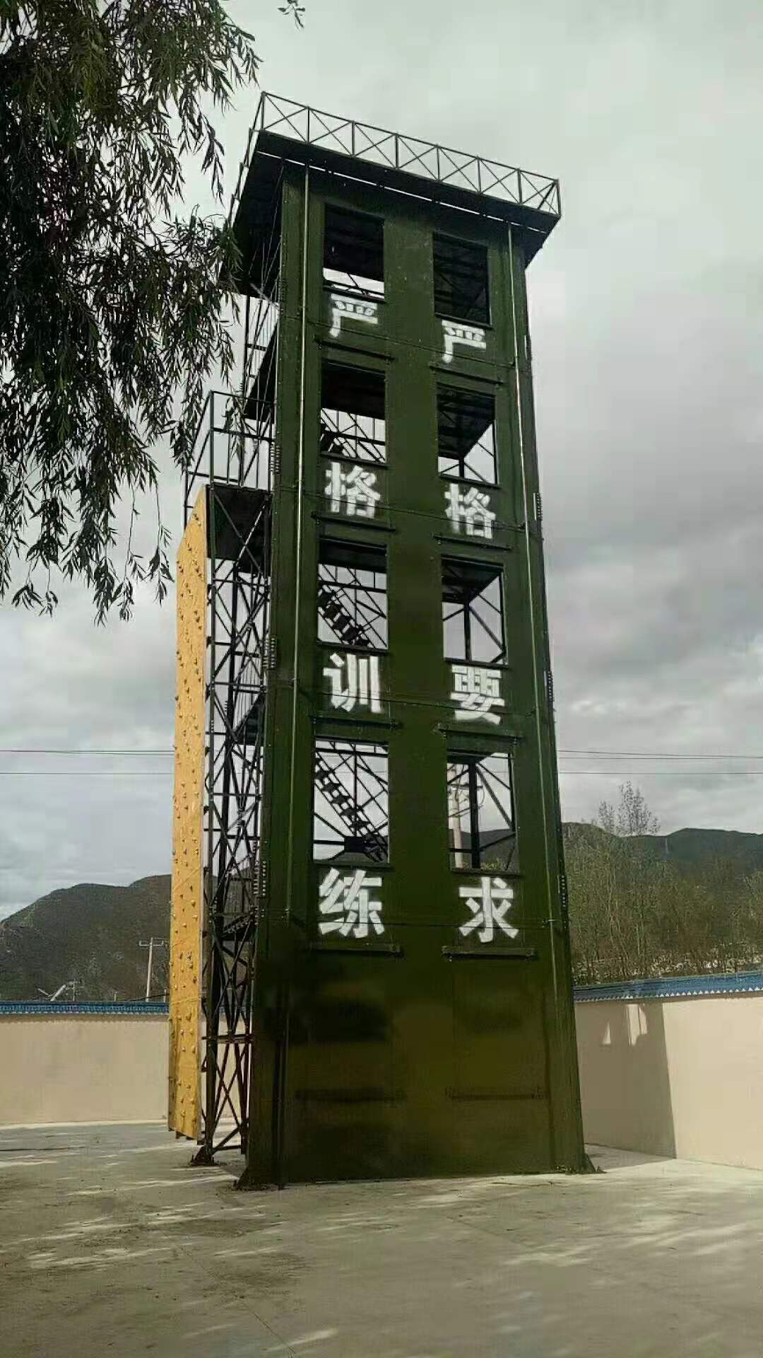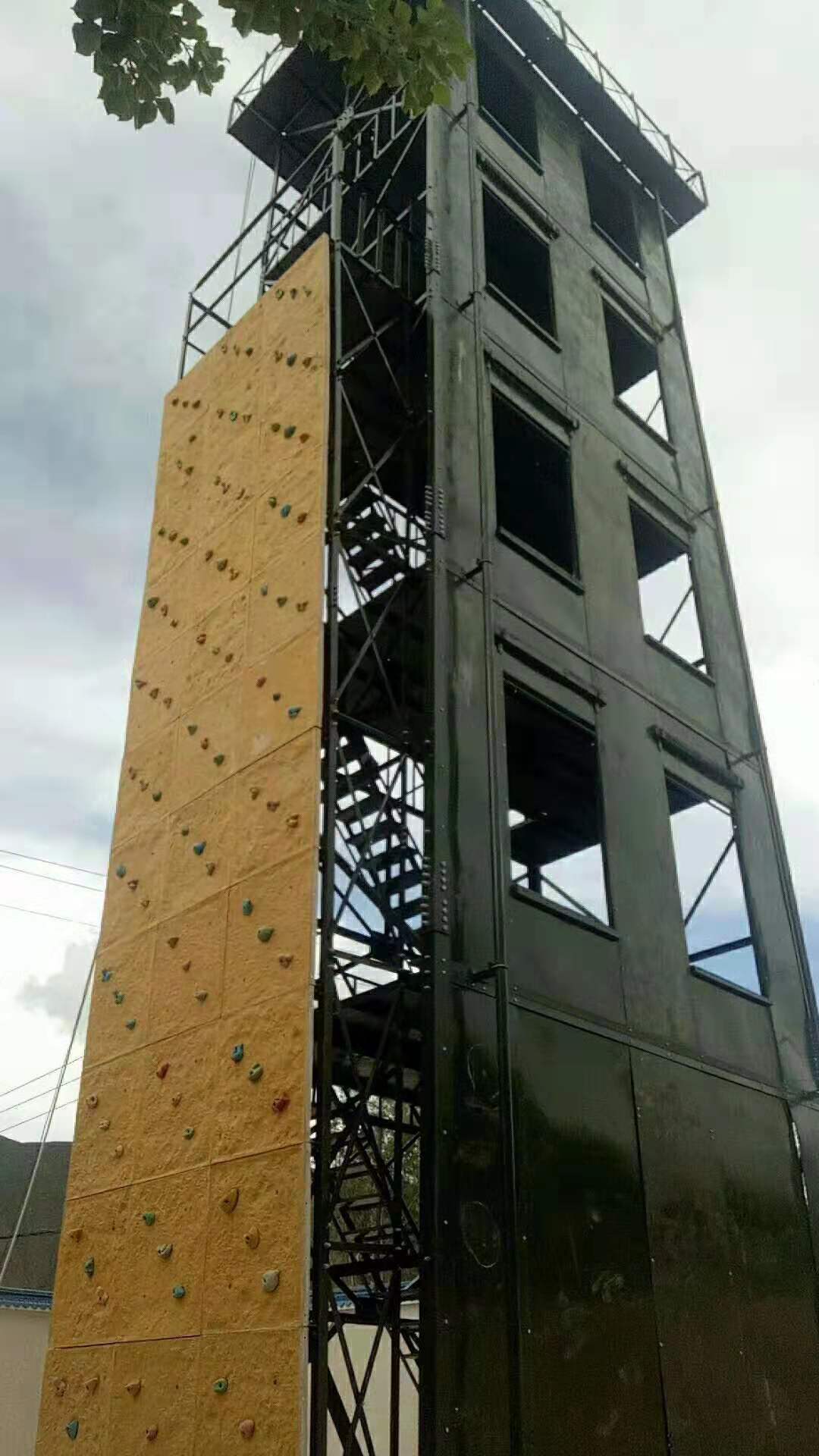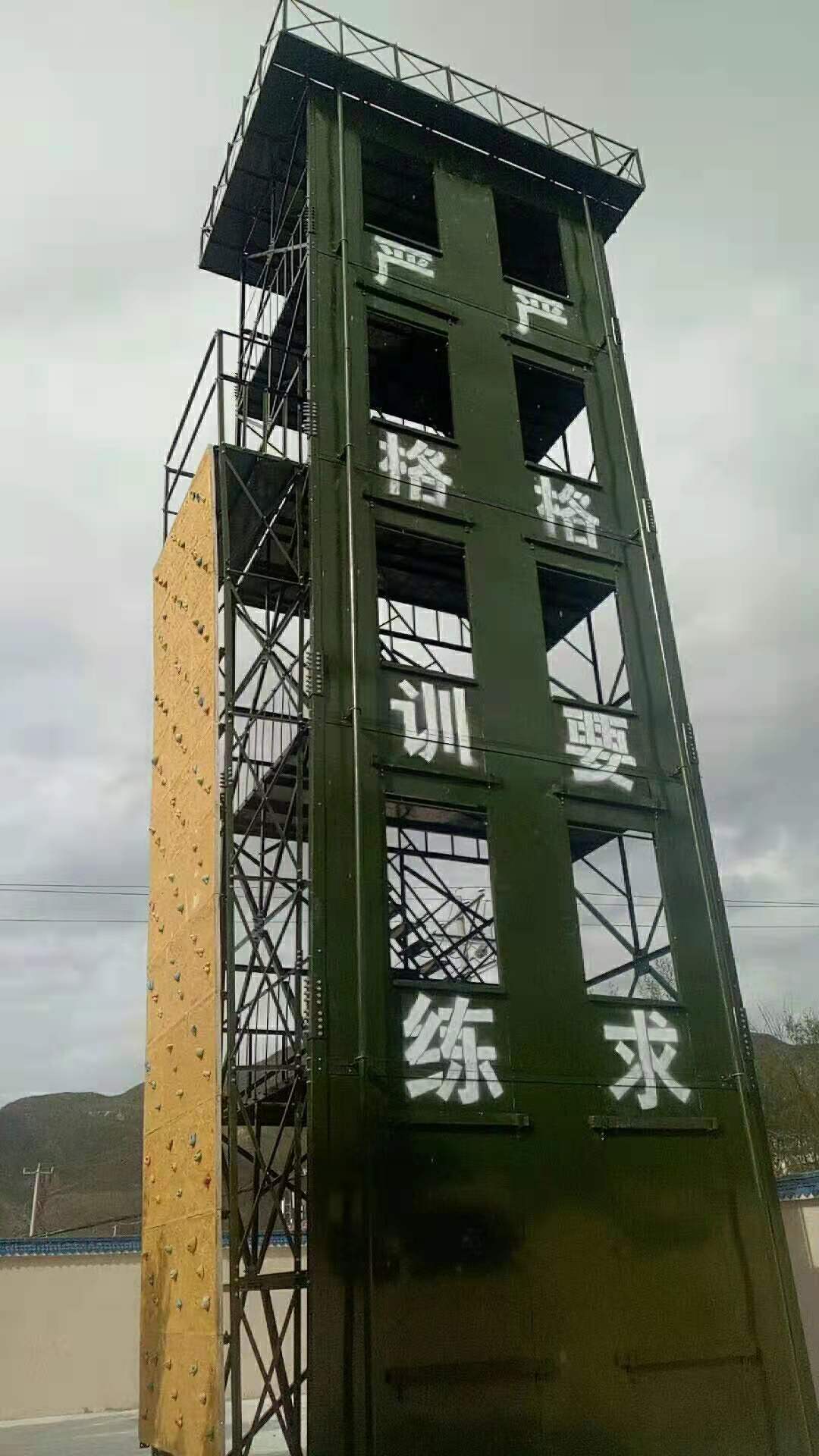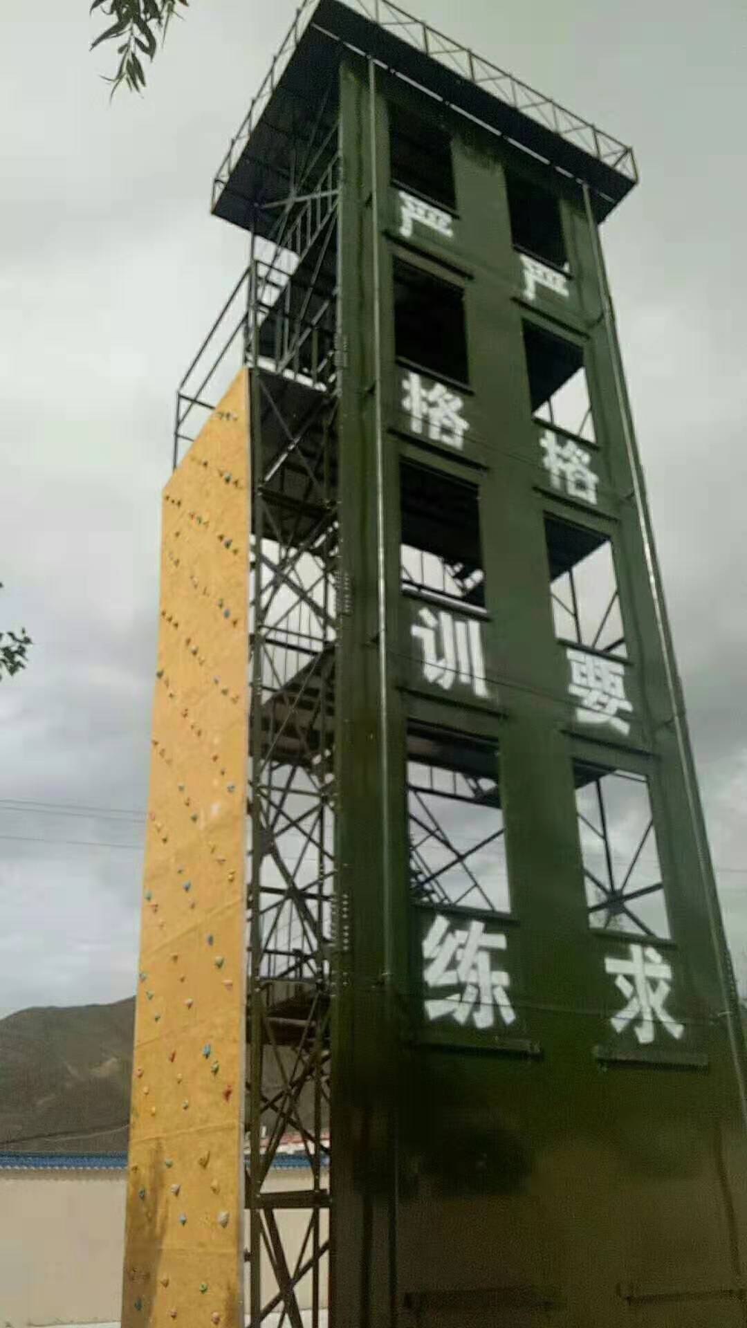 六、训练塔宜设置室外消防梯。消防梯应通至塔顶,并宜离地面3米高处设起,宽度不宜小于50厘米。)消防训练塔产品说明:多功能消防训练塔,主要由(1)模拟窗、(2)楼层隔板、(3)后骨架、(4)了望、指挥平台骨架及主体钢结构框架等组成。在塔体前端部位设有八个模拟窗(根据需要定做几层几窗口),在上、下相邻的模拟窗之间设有楼层隔板(钢板)。2、在塔体后部下方设有与模拟窗相对应的后骨架。3、模拟窗与楼层隔板以及后骨架及主体框架相互之间用螺栓连接为一体,4、层与层之间均有安全楼梯连接。5、塔体上部装有了望、指挥平台。6、根据需要可安装测风仪、凉水带架和警报器等。7、根据需要,在消防训练塔旁边可制作模拟消防训练井。8、消防训练塔设备同时还配备消防专用滑轮、滑竿、模拟墙等附属设施。本训练塔结构科学、操作安全、使用方便,产品防腐处理热镀锌或热喷涂处理,50年无需维护,安全可靠。具有消防训练、了望、测风、等多种功能。同时便于指挥长随时掌握的动作要领。是目前训练实战演习之必备设备。同时替代了过去砖混结构消防楼的历史。