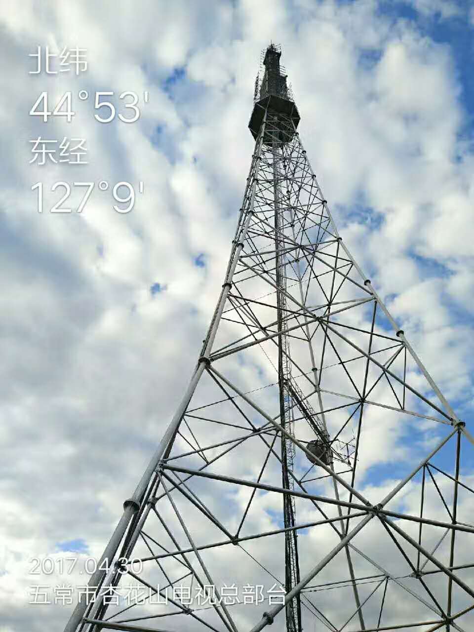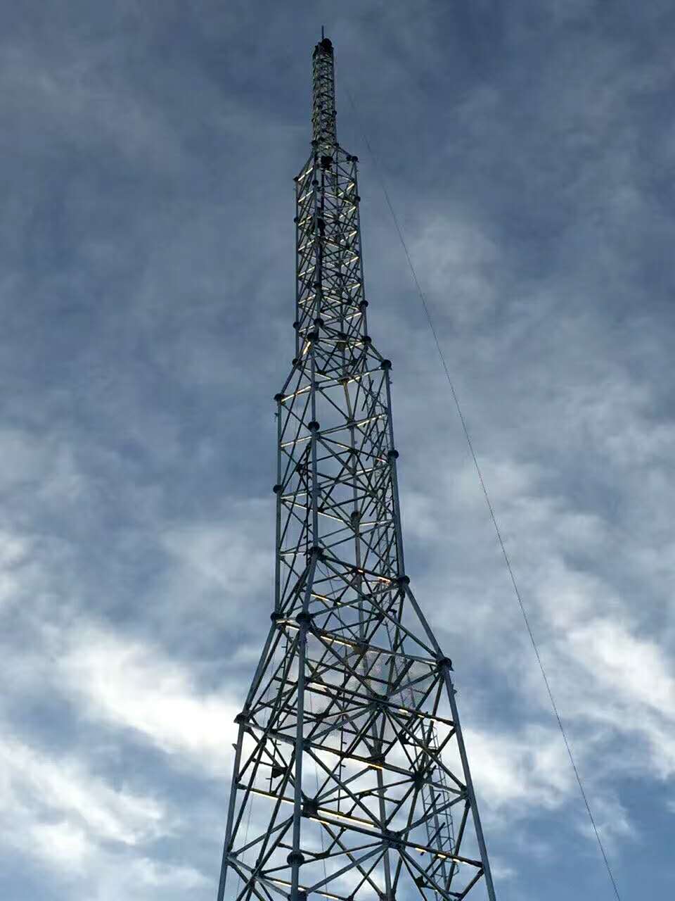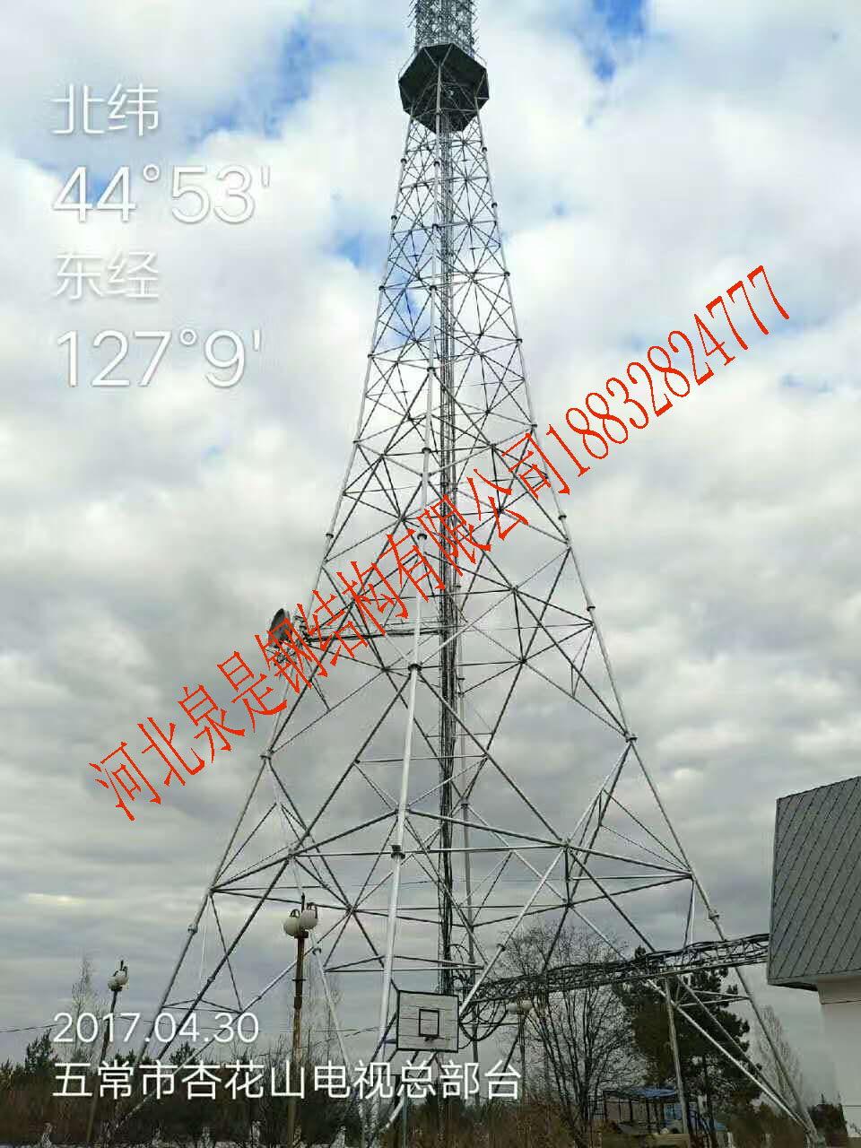 广播电视铁塔上设置用于工艺、燎望等用途的平台。其层次、数目与布置高度需根据使用要求确定。平台形状视塔身截面而定,平台结构的构件一般都采用角钢、槽钢、工字钢等型钢制成,为了便于高空安装,构件之间先用焊接连接成吊装单元,各单元之间用螺栓连接。
