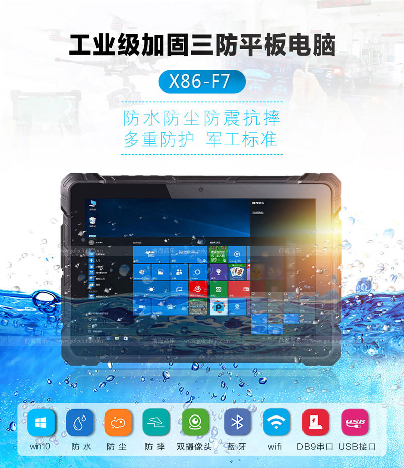 前海高乐专业定制x86带充电底座的安防加固三防平板电脑厂家,采用无风扇Intel z8350主控方案,具备防水、防尘、防摔的特性,可经过IP67防护等级认证,满足美军标MIL-STD 810G测试标准,能承受1米高度以内不同角度的抗摔测试。内置丰富接口1xHDMI、3xUSB 2、1xUSB 3 OTG、1X微SD卡插槽、1X耳机、1xCOM、1xDB9,可支持条码二维扫描、NFC、指纹识别、双高清摄像头、GPS导航定位等功能模块。