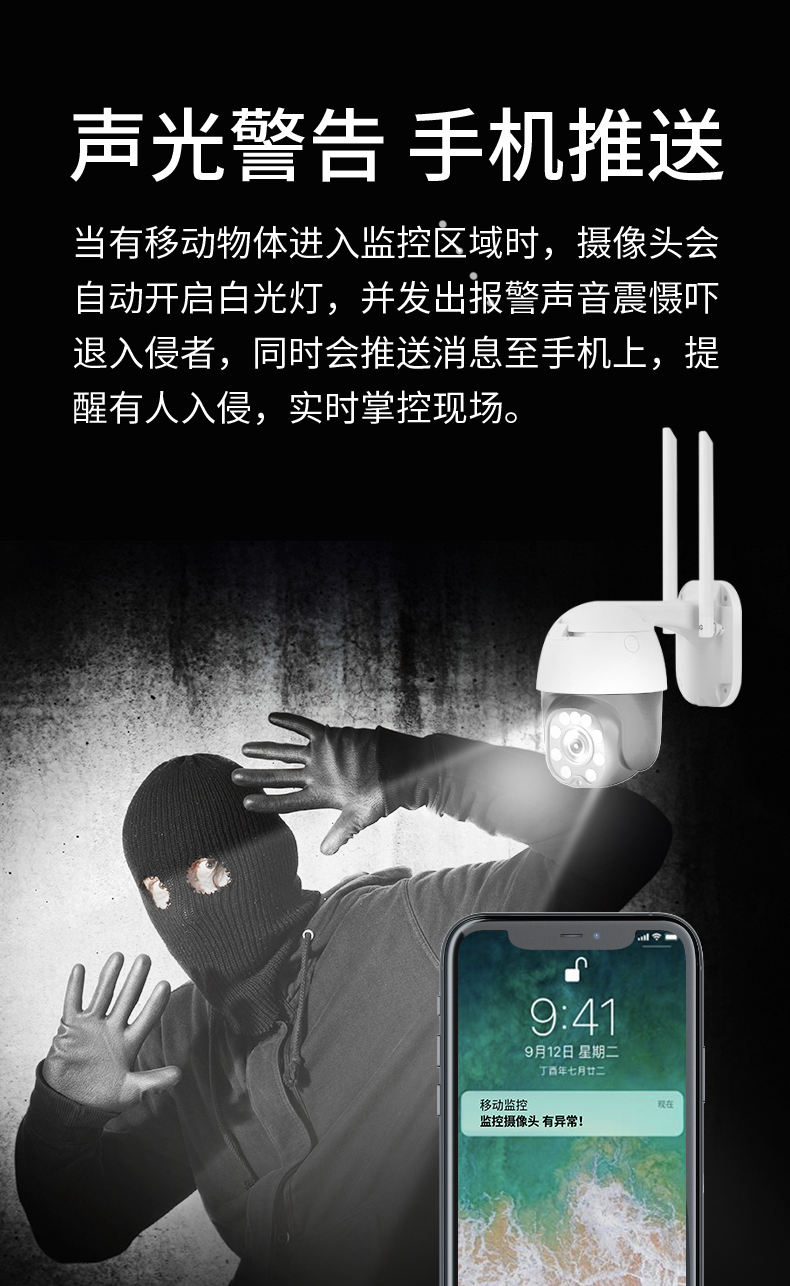 2、光感:夜晚或照度低于10Lux时,启动白灯或红外补光
