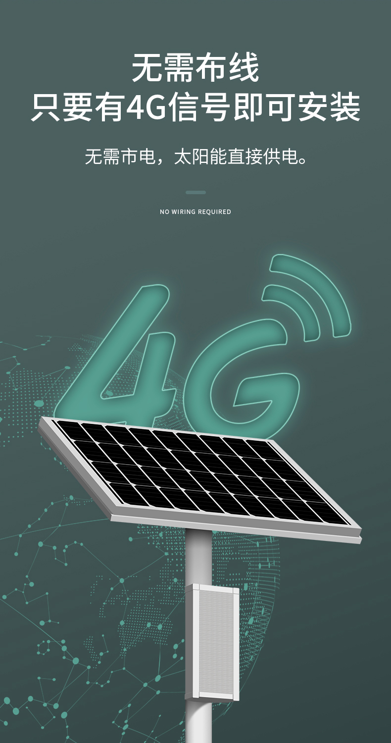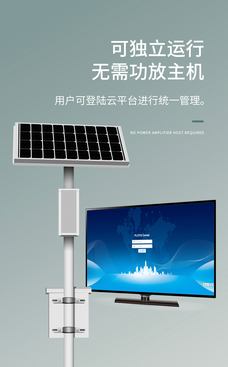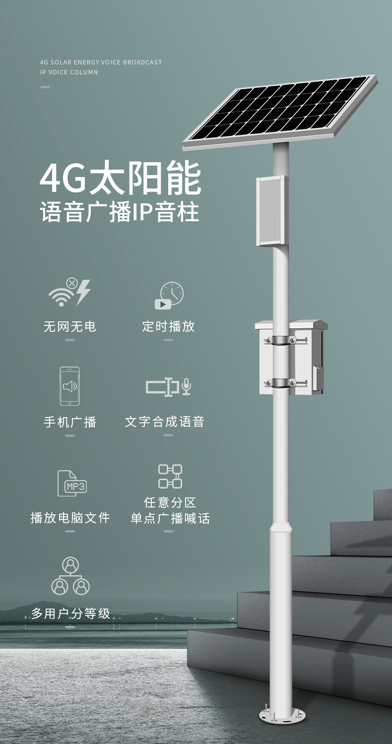 太阳能网络音柱;内置嵌⼊式⽹络语⾳解码模块,完成⽹络⾳频流的接收和解码; 采⽤⾼速⼯业级1GHzSOC芯⽚。 内置嵌⼊式⽹络语⾳解码模块、双通道输出功放,差分输出立体声信号纯净