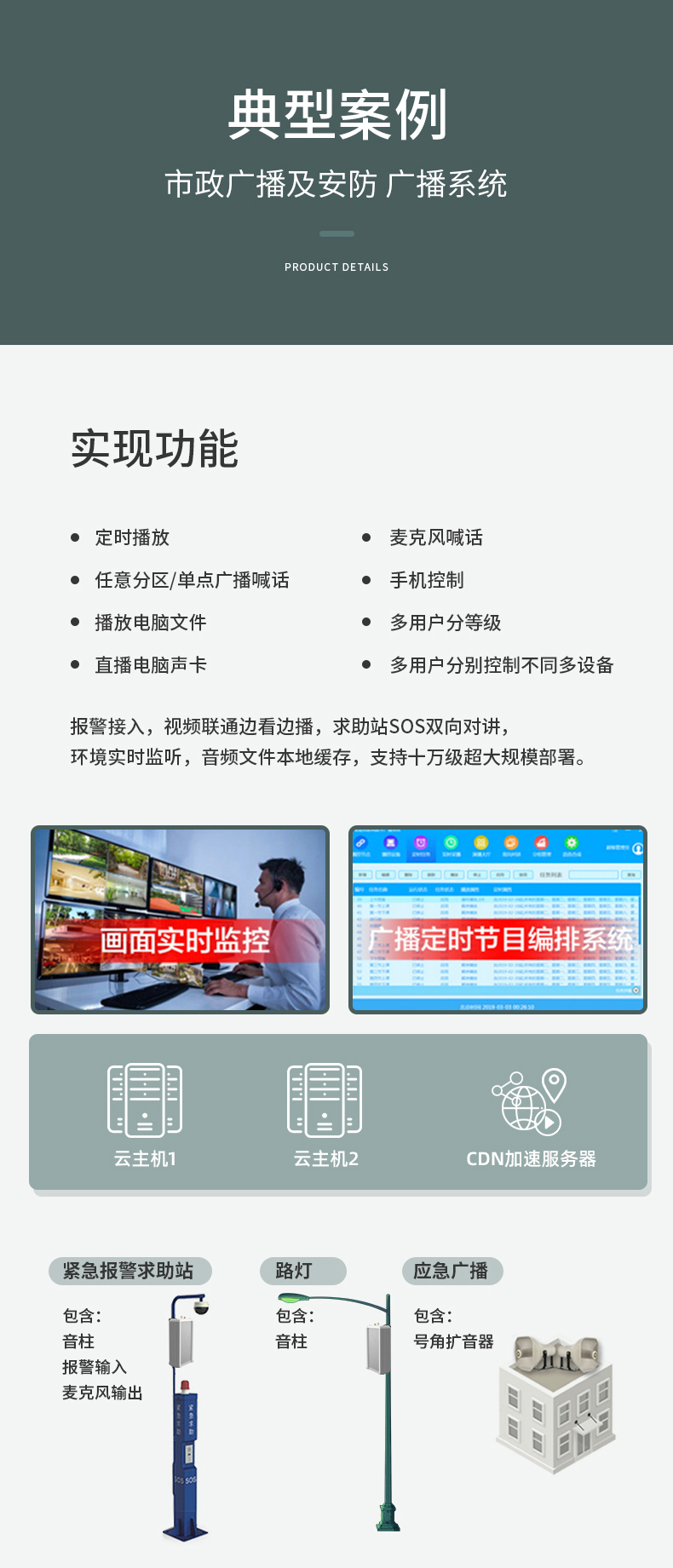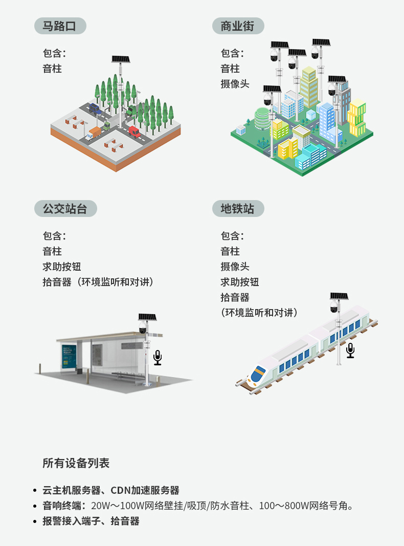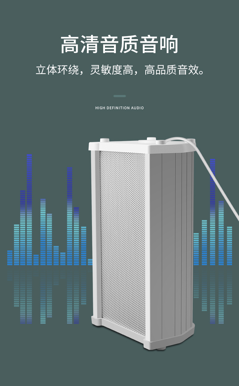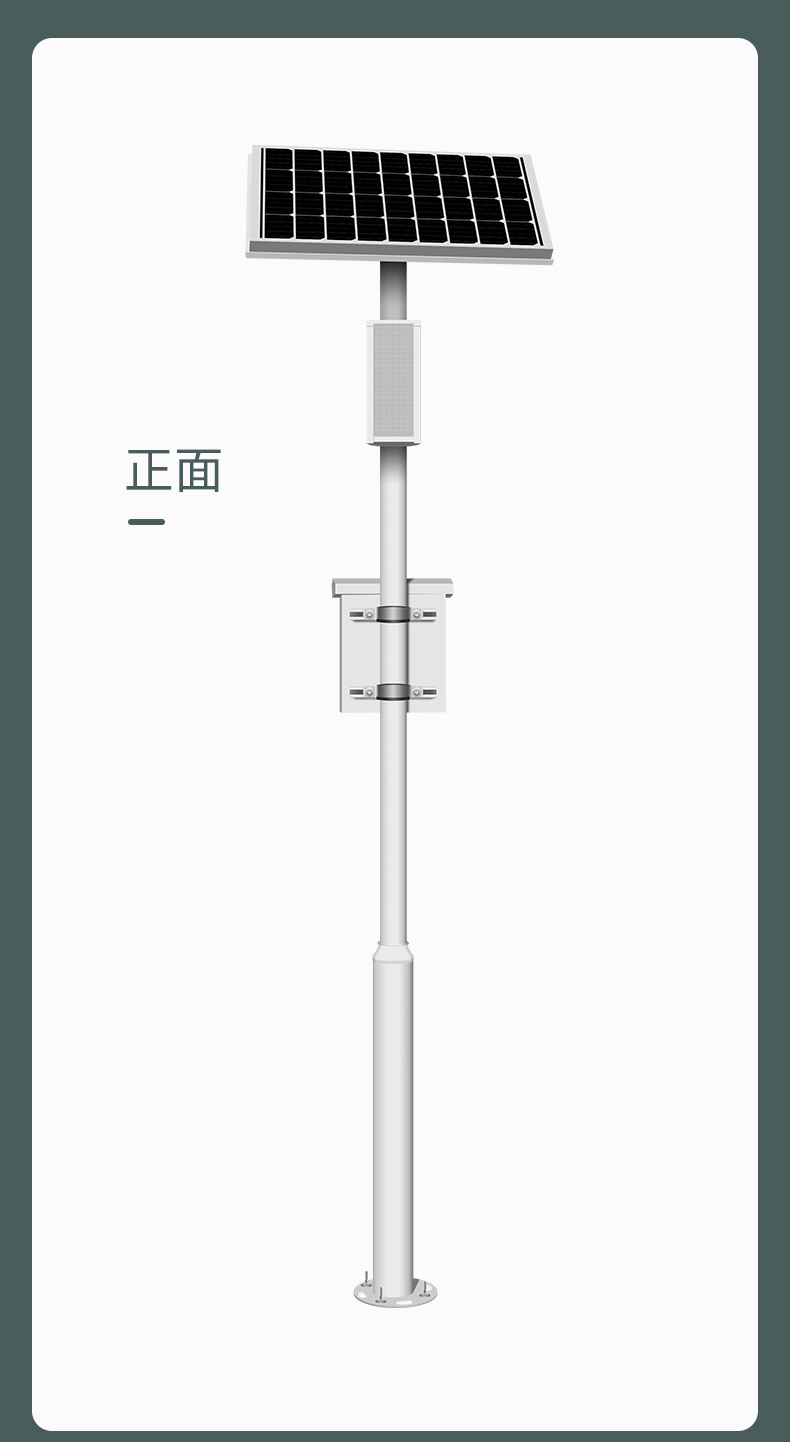 太阳能网络音柱;内置嵌⼊式⽹络语⾳解码模块,完成⽹络⾳频流的接收和解码; 采⽤⾼速⼯业级1GHzSOC芯⽚。 内置嵌⼊式⽹络语⾳解码模块、双通道输出功放,差分输出立体声信号纯净