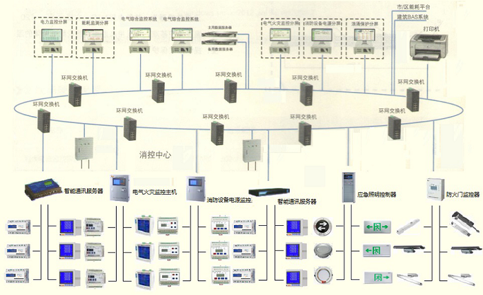 本监控系统整合了电气火灾监控、消防设备电源监控、电力监控、能耗监测和浪涌保护监测、电力质量监测等功能,采用共用具备综合功能的现场采集装置产品,通过相同的网络通信层,传输到消防控制室的综合电气监控系统主机,并可通过共用的网络通信层传输到变电所值班室内的电力监控、能耗管理和浪涌保护监控分屏主机显示,也传输到消防控制室的电气火灾监控和消防设备电源监控分屏主机显示,从而实现集中采集、集中传输、集中显示和分屏分区显示方式。