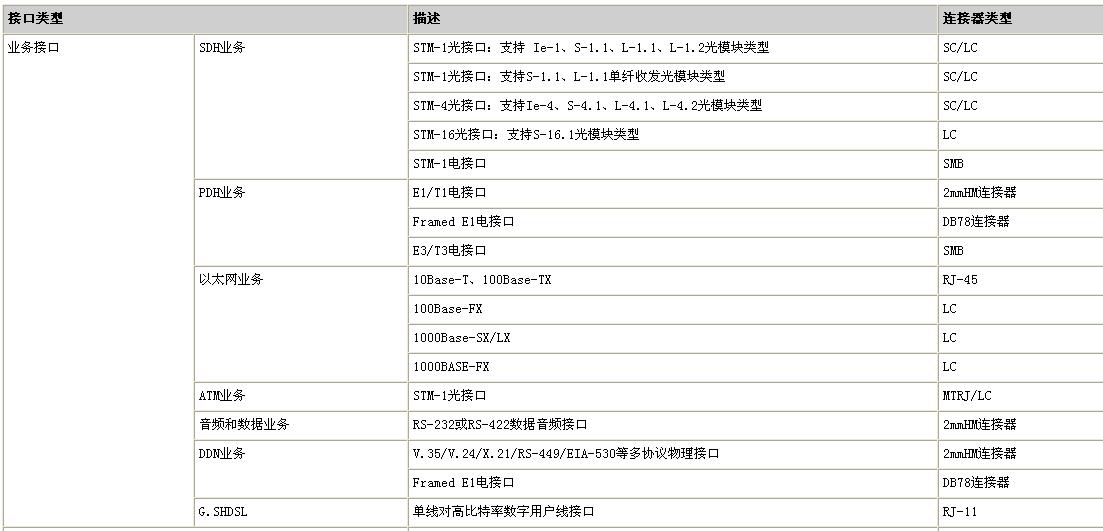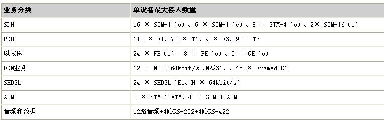 华为155/622H具有非常高的的集成度,可以支持多种业务类型的接入,且可以与无线基站、以太网交换机等设备进行对接。如图表可以看到metro 1000的业务类型和接入数量: