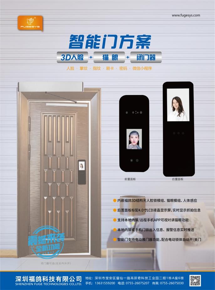 3D人脸识别+猫眼+闭门器 智能门方案