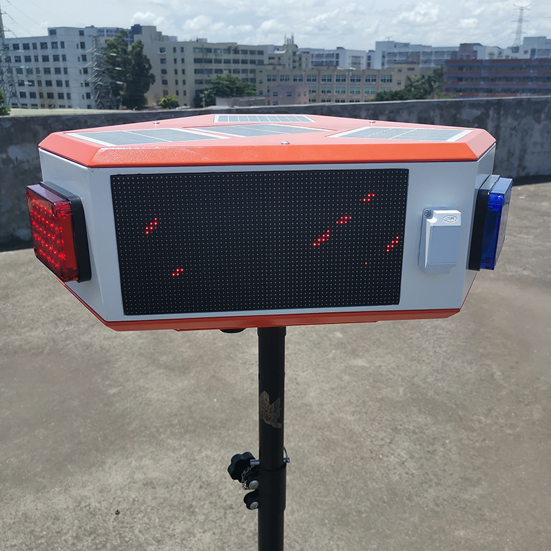 太阳能语音播放器(移动LED款),通过置放于人流/车流通行的卡口位置,移动触发(微波/红外)工作模式,当感应到移动的人或物体时,高音喇叭立即提示:“前方道路施工,请绕道行驶,给您带来的不便,敬请谅解”,同时红蓝色警示灯开始暴(频)闪提示。 有效预防因道路施工及改造,带来的车辆拥堵和行人安全事故。既满足施工组织、施工进度的要求,又确保了交通畅通和安全施工。