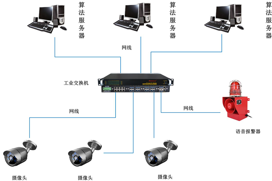 在采油机设备的各个重点监控部位加装摄像机,通讯方式采用工业级交换机,专为极端环境设计,防潮、防水、防盐碱腐蚀。可以采用点对点、点对多点方式组网。数据回传至监控中心进行统一处理,当发现设备异常后进行存储,并通知现场设备管理人员进行查看。在设备操作区域加装人员标准着装检测摄像机,对进入区域的人员进行监控。