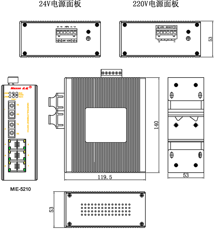 MIE-5210MD | 6个10/100M电口,2个100M多模SC光口,1310nm,0-2km,支持环网,支持断电保护,输入电压:DC24V |