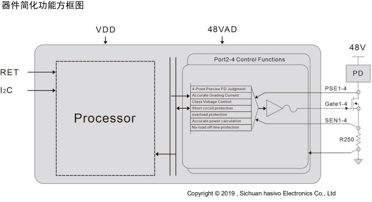 HS104PBI 是一款基于 IEEE802.3af/at /bt 协议 的PSE 控制器 。该器件无需借助任何外部控制即可自动管理 4 个 802.3bt 端口(最大功率 90W/端口);器件支持 CLASS0-8 级分级功率。
