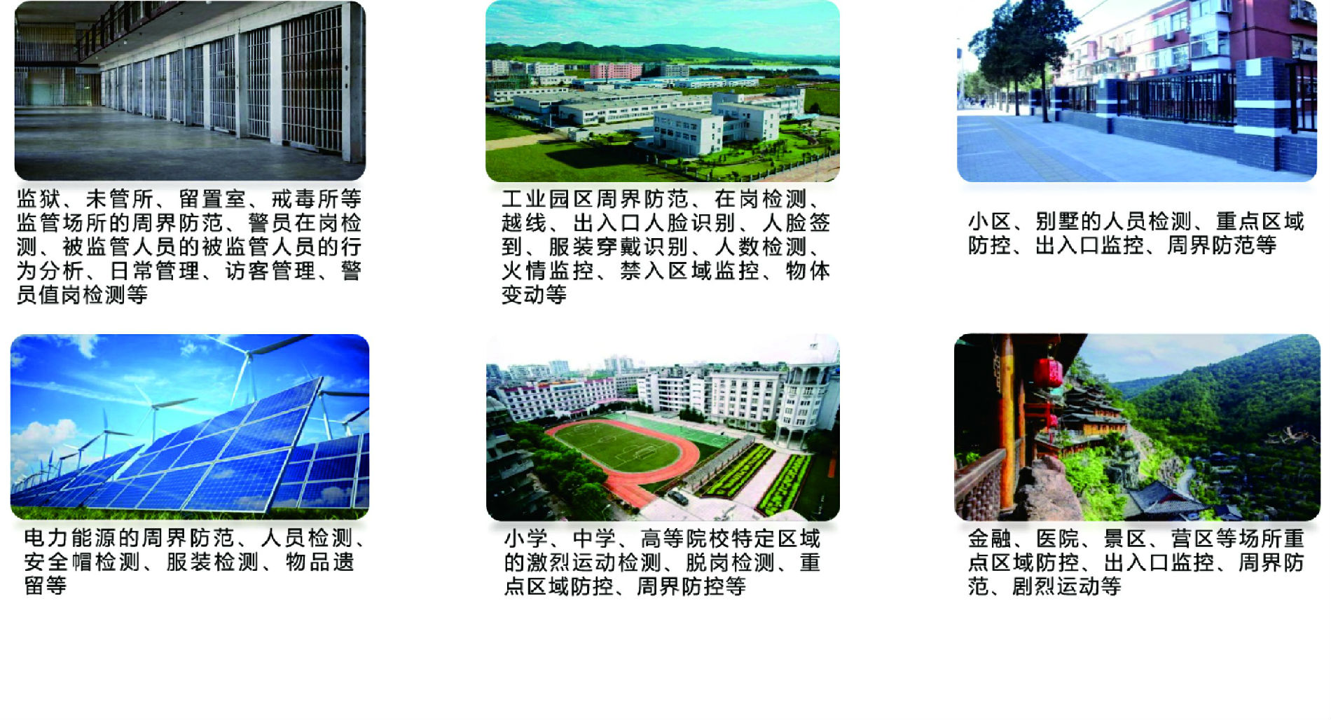 弘度视防产品高度适用于未管所、留置室、戒毒所等监管场所的周界防范、警员在岗检测、被监管人员的行为分析,同样适用于金融、医院、学校、景区、营区、住宅、仓库工厂的周界及重点区域、部位管控场景。