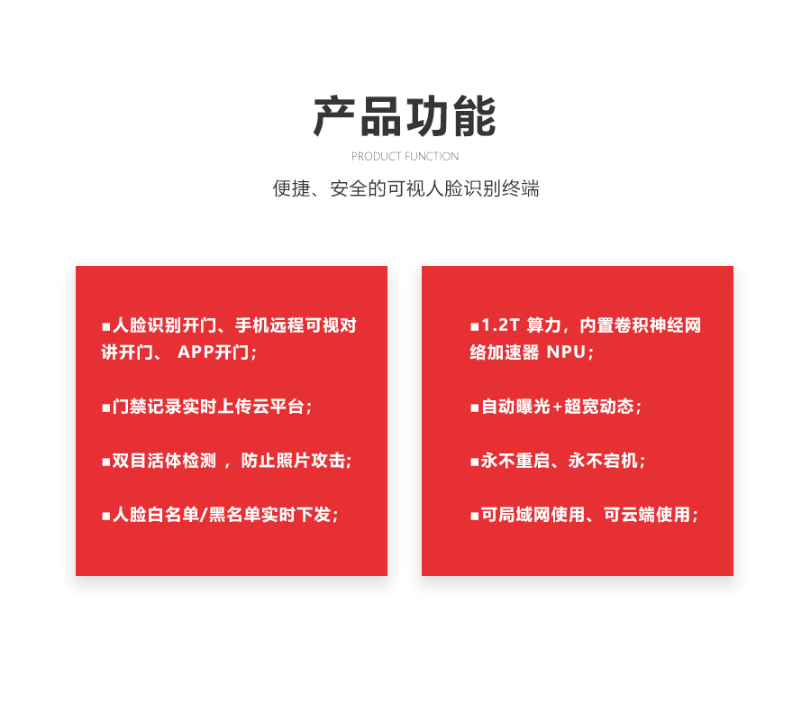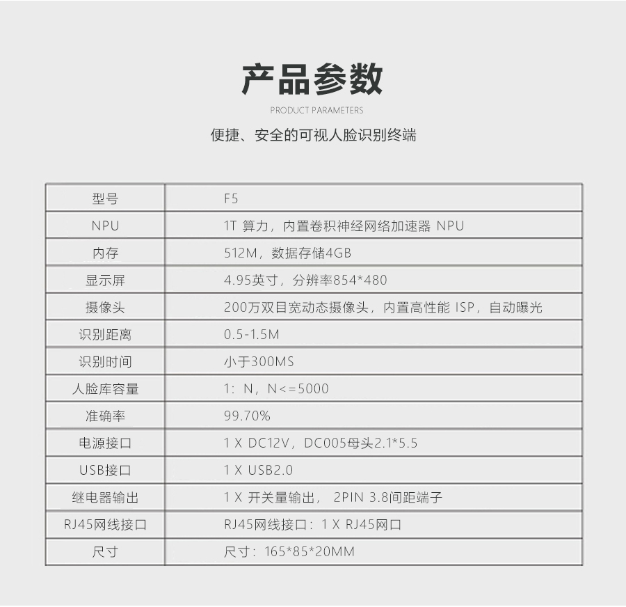 F5人脸识别智能终端是一款便捷、安全的可视人脸识别终端。产品能应用于智慧社区、门禁通道、人脸考勤、酒店、写字楼、学校、商场等场所的通行场景,有助于实现智能化安全管控。F5人脸识别智能终端使用领xian的人脸检测、活体识别算法,在1W 人脸库下,活体检测+人脸识别时间小于0.2秒。主机运行Linux系统,提供标准对外接口。建议在人脸库1W的场景下使用。