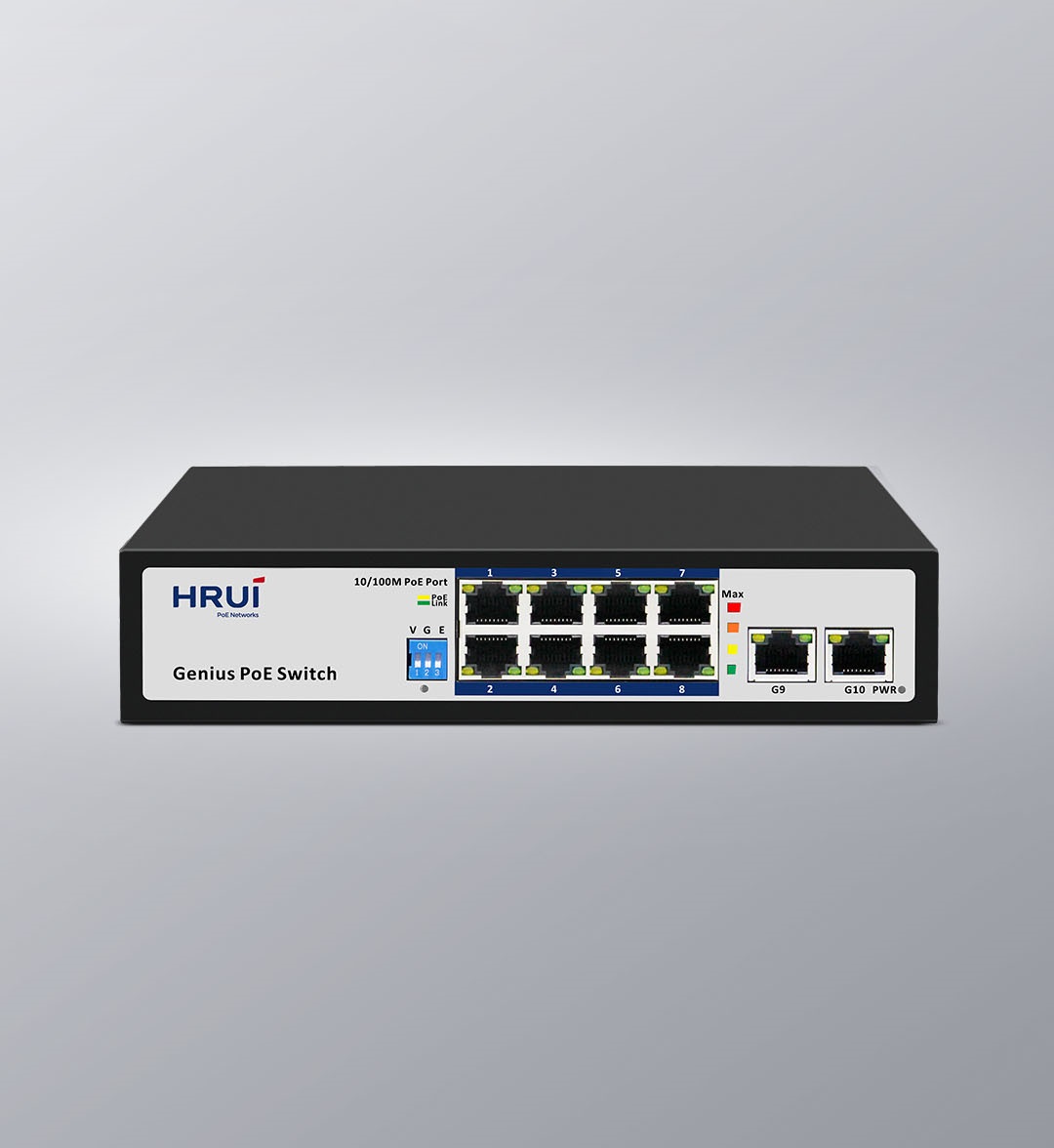 产品配置8个百兆PoE网口+2个千兆上行网口,符合IEEE802.3af/at国际标准,端口最大功率30W,整机功率120W,背板带宽5.6Gbps,4挡功率占用比例显示灯板,三挡立式拨码开关,支持VLAN、Genius PoE、Extend三种模式,默认开启QoS网络优先级功能,支持序列端口PoE优先级,支持PoE看门狗功能,端口4KV防雷,8KV防静电保护,适应-20°C~+50°C宽温环境工作。