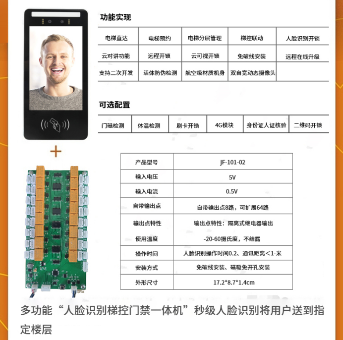 一、小门卫电梯人脸识别梯控一体机可选配置:门磁检测、体温检测、刷卡开锁、4G模块、身份zheng人证核验、二维码开锁