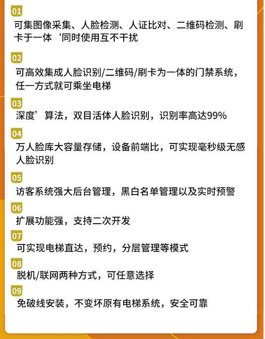 五:小门卫电梯人脸识别梯控一体机的九大优势满足写字楼/园区/住宅人员进出管理以及电梯安全同行。