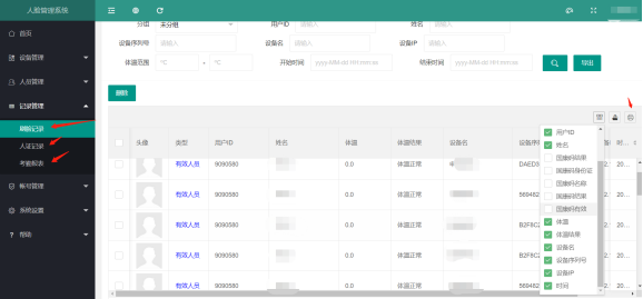 设备检测到人员的体温数据,通过云端实时上传至管理平台,便于管理人员查看相关数据,对异常数据有迹可循。2.非接触考勤,提升考勤效率