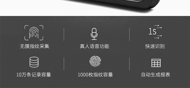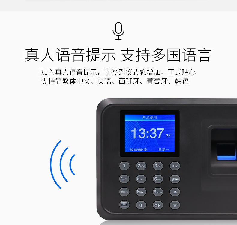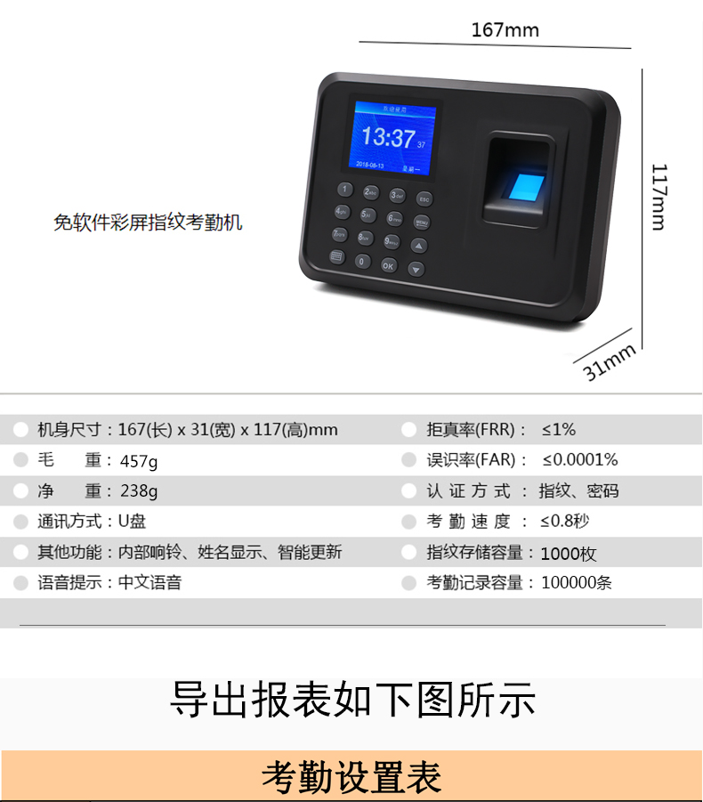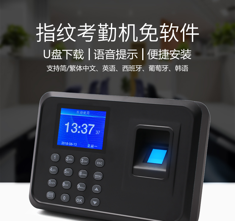 指纹考勤机免软件,U盘下载,语音提示,便捷安装;无膜指纹采集,真人语音功能,快速识别,10万条记录容量,1000枚指纹容量,自动生成报表;免软件安装只需三步,从此不需要将考勤机连接电脑设置,直接在考勤机上完成简单设置免软件安装,只需三步完成即可完成指纹人脸录入,方便快捷;核心技术搞定轻松考勤,2.4英寸TFT彩屏,界面简洁时尚,设置简单;感光度高,对环境光的要求低,环境照亮些暗些都好识别;超强芯片,高速32位双核处理器、识别速度快、精准、少误差;无膜指纹采集器,采用光学无膜指纹采集器,支持干湿手指,识别率高;真人语音提示,让签到仪式感增加,正式贴心,支持多国语言,简繁体中文、英语、西班牙、葡萄牙、韩语;支持脱机考勤,智能生成报表供您查阅,无需编辑,一目了然。