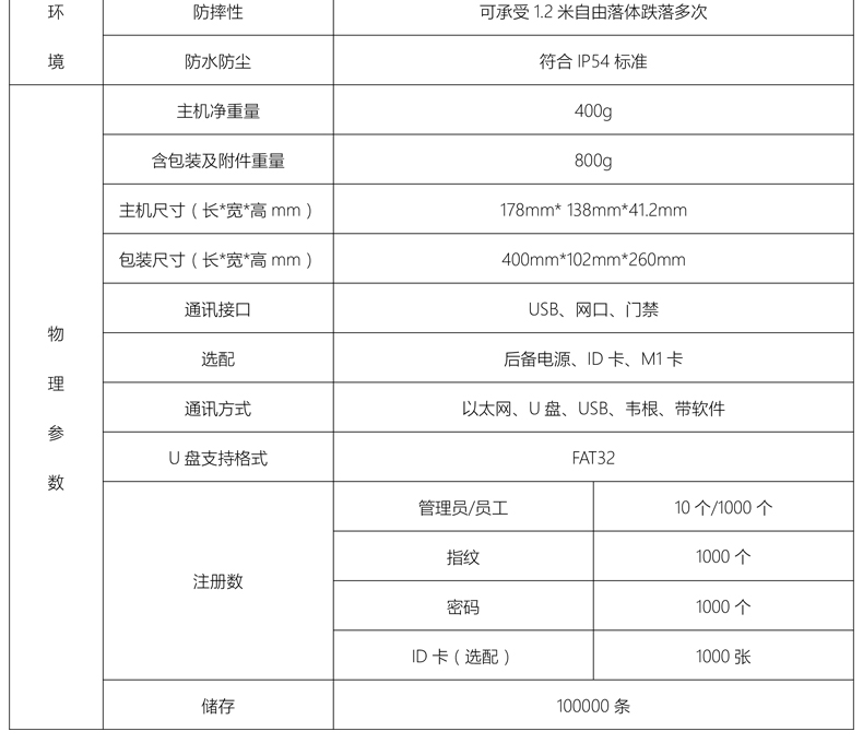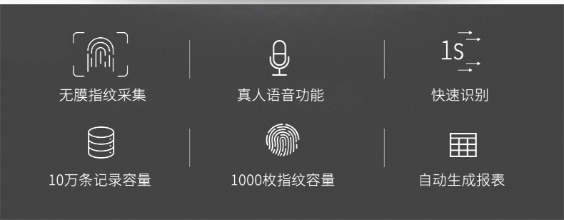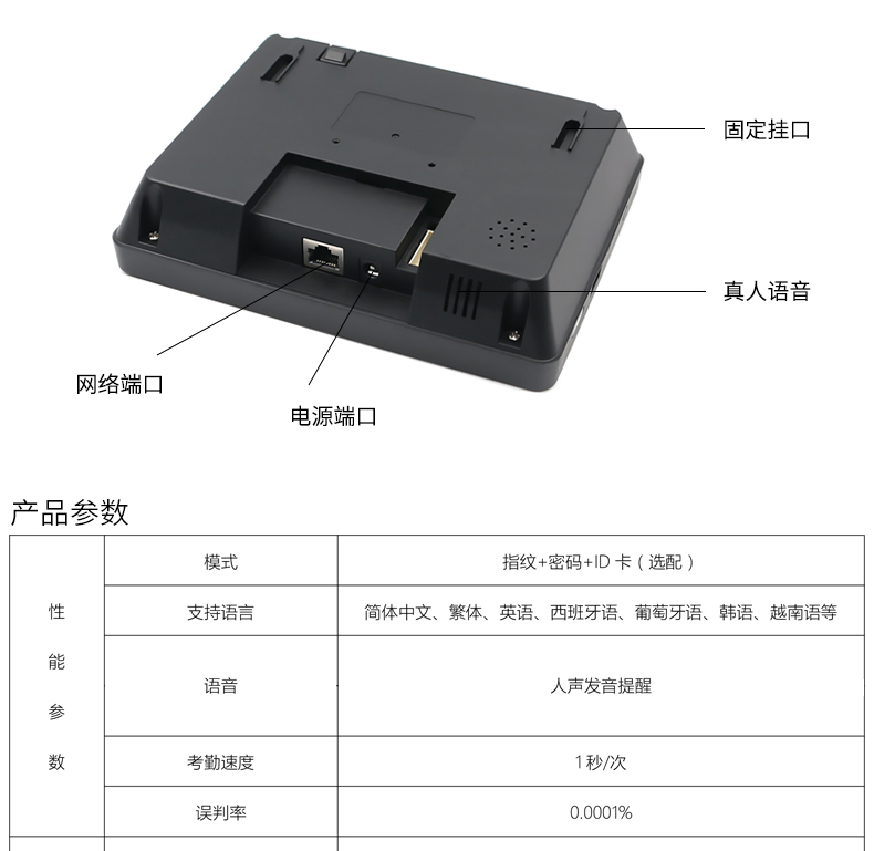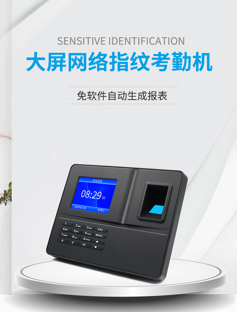大屏网络指纹考勤机,免软件自动生成报表;无膜指纹采集,真人语音功能,快速识别,10万条记录容量,1000枚指纹容量;免软件安装只需三步,从此不需要将考勤机连接电脑设置,直接在考勤机上完成简单设置,只需三步完成即可完成指纹人脸录入,方便快捷;多种验证,快速识别,指纹,密码,可选ID卡,多重识别,简单门禁功能;核心技术搞定轻松考勤;真人语音提示,让签到仪式感增加,正式贴心,支持多国语言,简繁体中文、英语、西班牙、葡萄牙、韩语;可选停电打卡,断电照打卡,机器内置电池,停电使用可持续4小时,不担心考勤丢失;自助报表,多种方式下载,U盘下载,配置标准TCP/IP通讯协议,可联网查看设置考勤和统计;可设置报表密码,让考勤数据更安全。