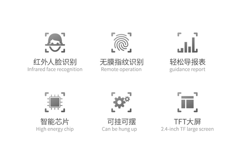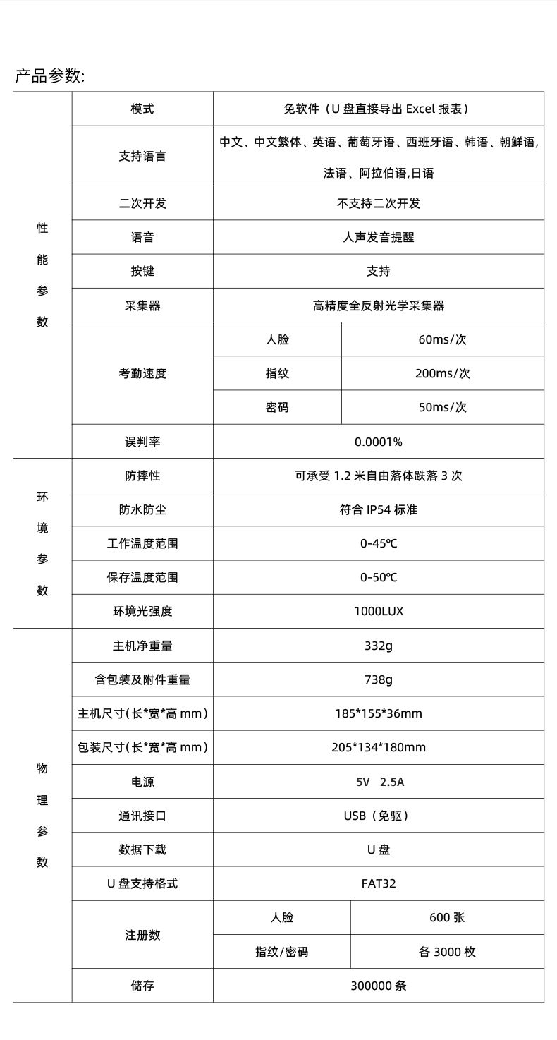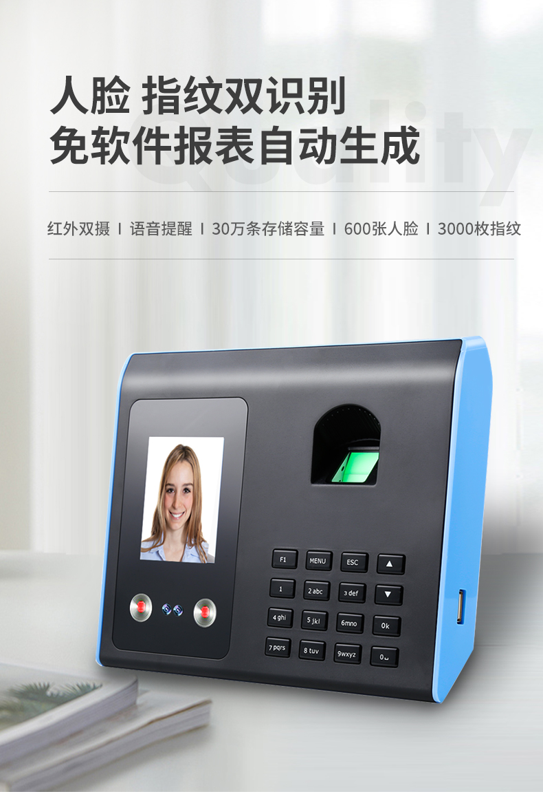 人脸指纹双识别,免软件报表自动生成,红外双摄,语音提醒,30万条存储容量,600张人脸,3000枚指纹;人脸考勤更灵敏,全新一代红外人脸SmackFacev2.2算法,秒速识别人脸维度,即使夜间等暗光环境,也能快速识别;岂止于快,面部识别更智能,红外多光源照射,高清双摄像头,三维立体成像,不错漏如何细节;无膜指纹采集,轻松应对异常指纹采集,360°指纹识别技术,对不同角度的手指都可快速识别;闪电识别秘密,32位双核闪能芯片,32位双核处理器,响应时间低于1秒,速度快人一步;U盘一键轻松导报表,统计管理得心应手;大容量,大作为,减少频繁导出报表;清澈人声提醒,签到结果秒知道;好设备不挑剔,放置挂置都行;可设置报表密码。