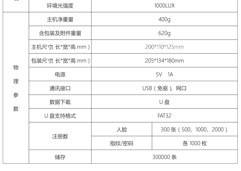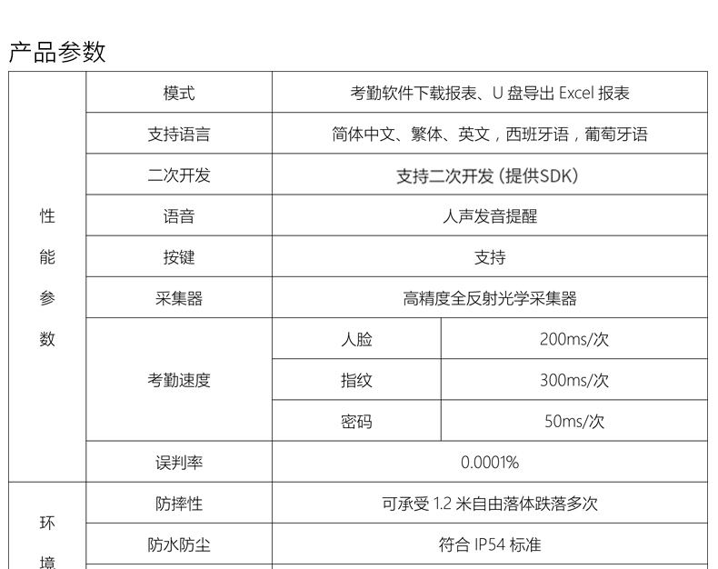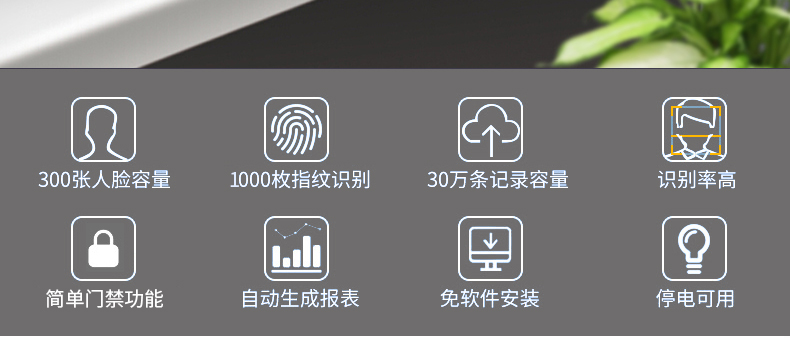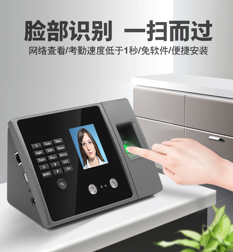 脸部识别,一扫而过,网络查看,考勤速度低于1秒,免软件,便捷安装;300张人脸,1000枚指纹识别,30万条记录容量,识别率高,简单门禁功能,自动生成报表,免软件安装,停电可用;多种验证,快速识别,指纹,密码,可选ID卡,多重识别;刷脸考勤,高效工作,只需往考勤机前一站,即可快速打卡成功;红外双摄像头,多环境识别,不错漏如何细节;真人语音提示,让签到仪式感增加,正式贴心,支持多国语言,简繁体中文、英语、西班牙、葡萄牙、韩语;无膜指纹采集器,快速识别,寿命长;可选停电打卡,断电照打卡,机器内置电池,停电使用可持续工作4小时,不用担心考勤丢失;自助报表,多种方式下载,U盘下载,配置标准TCP/IP通讯协议,可联网查看设置考勤和统计;可设置报表密码,让考勤数据更安全。