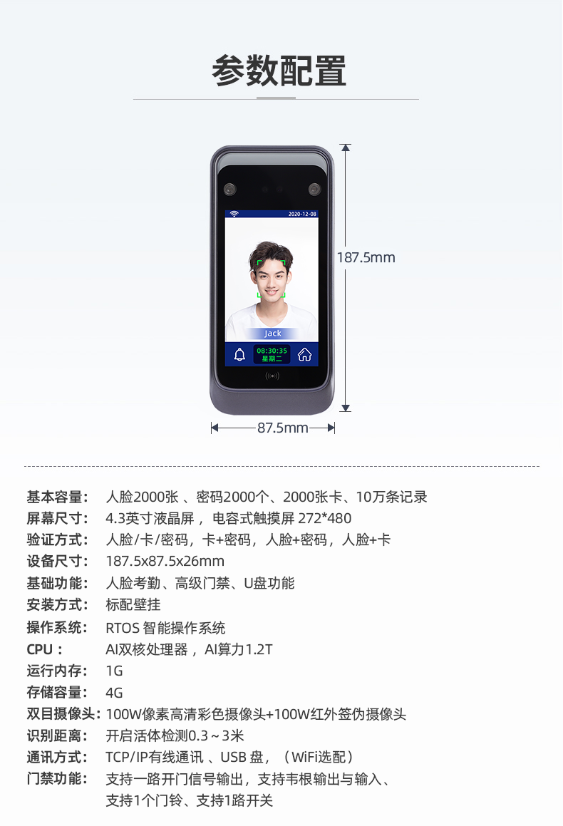 本产品为 AI 动态人脸识别考勤门禁一体机,搭载 AI 神经网络加速芯片 NPU 0.6TOPs 算力, 采用 Linux3.10 系统。