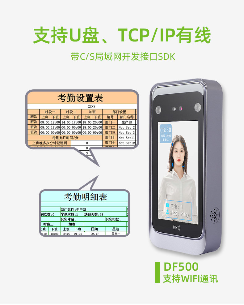 东为 人面刷卡考勤打卡门禁一体机 语音播报/一年保修/免软件安装/自动生成报表/U盘下载 门铃防拆报警 DF500