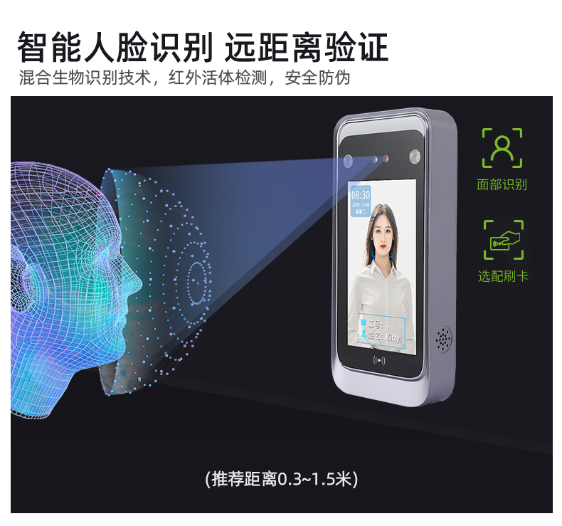 活体检测人脸识别距离 0.3 米~1.5 米;