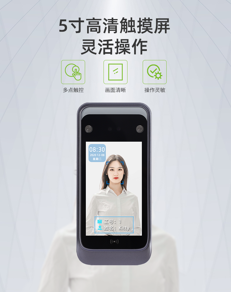 采用基于视频流的动态人脸检测、跟踪,1:N 识别算法。快至 0.3 秒准确识别人脸;