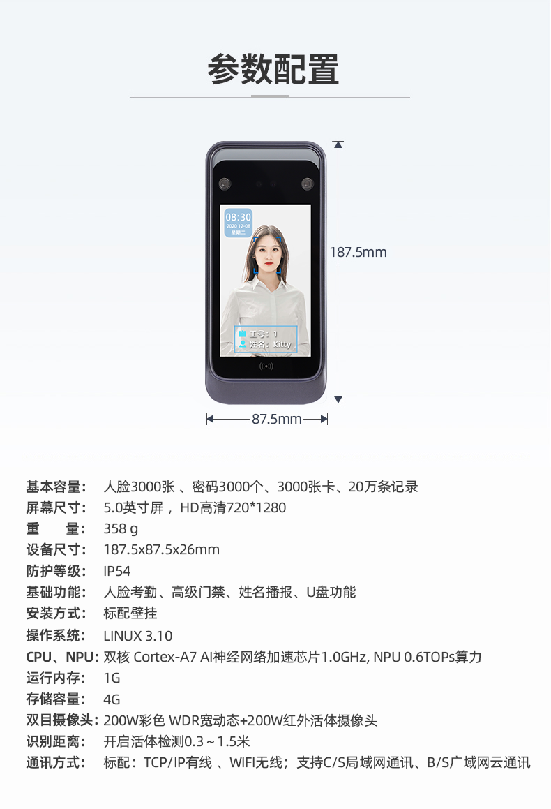 本产品为AI 动态人脸识别考勤门禁一体机,搭载 AI 神经网络加速芯片 NPU 0.6TOPs 算力, 采用 Linux3.10 系统。