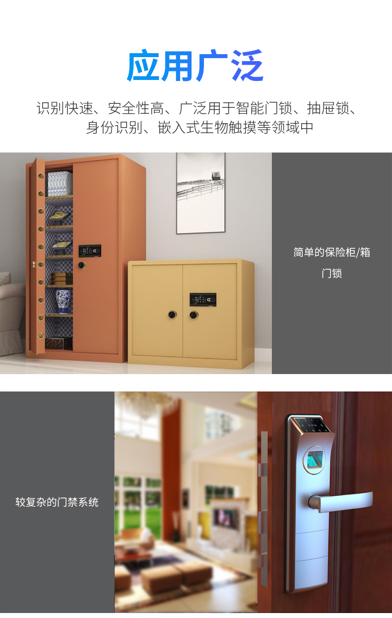 简单的保险柜(箱)、门锁;较复杂的门禁系统;指纹 IC 卡识别终端机;与 PC 联机的指纹识别及认证系统。