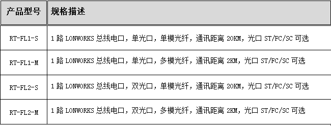 本产品是一款工业级LONWORKS现场总线光纤中继器,支持LONWOKS总线速率,数据全透明传输,支持单/双光口网络结构。RT-FL1支持一路总线数据接口,一路光纤接口,适用于点对点通讯结构;RT-FL2支持一路总线数据接口,二路光纤接口,适用于点对点、星型/级联拓扑通讯结构。