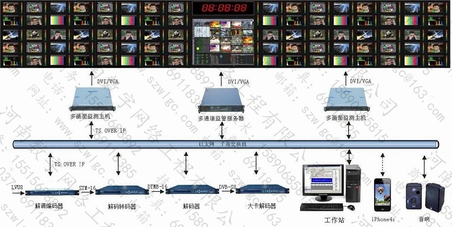 监测前端设备输出的TS OVER IP的单播/组播流进入多画面监测设备,多画面监测设备对输入的码流进行实时解码并输出到大屏上进行显示。