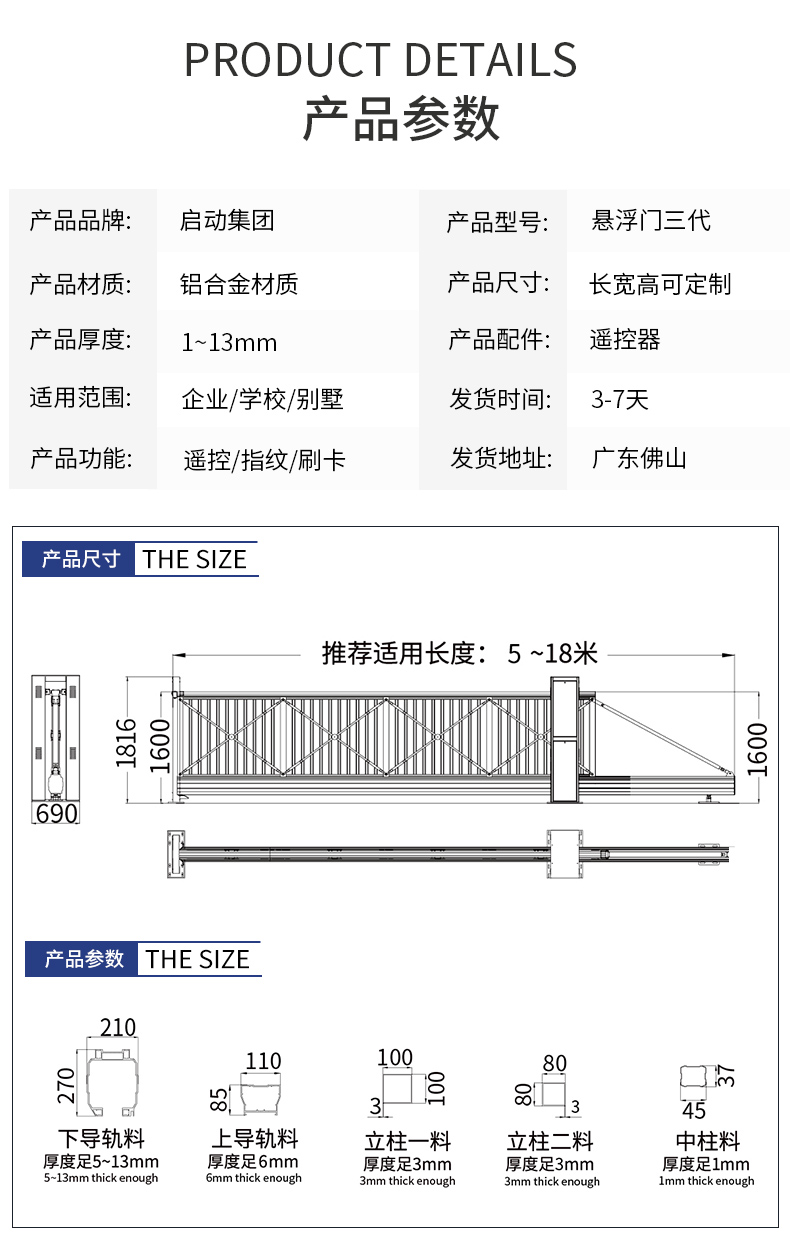 启功悬浮门三代QG-P2160学校智能电动工业大门可加装车牌识别系统