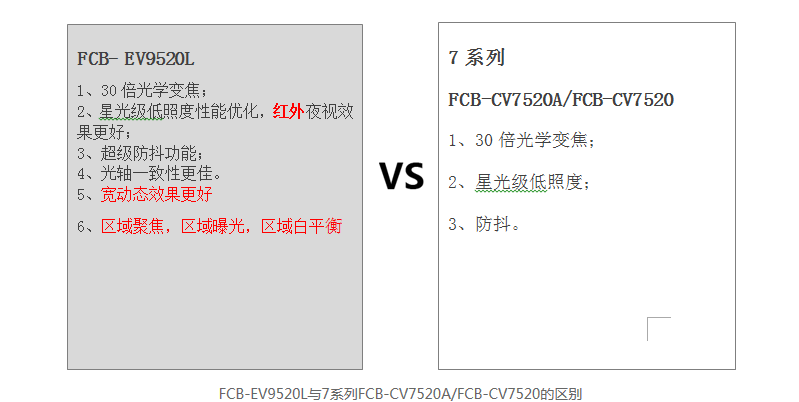 FCB-EV9520L相比7系列FCB-CV7520A/FCB-CV7520机芯有以下特点: