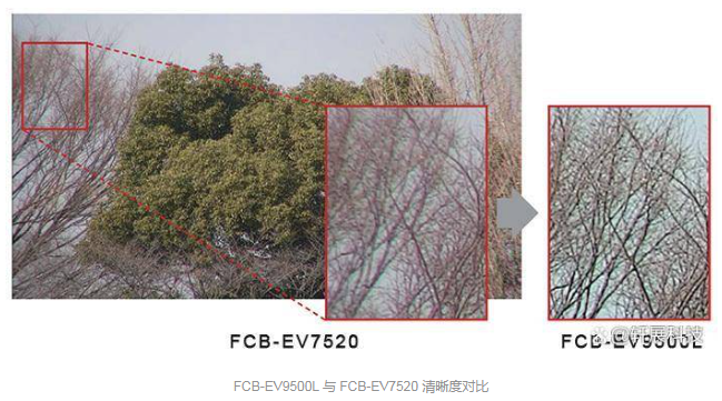 同样是30x光学变焦的镜头, FCB-EV7520的镜头参数为f=4.3mm(广角端)到129.0mm(远端),F1.6 到 F4.7,而FCB-EV9500L采用的是新的30x加强光学变焦镜头,镜头参数为f=6.5mm(广角端) 到 162.5mm(远端),F1.6 到 F4.8,该新设计的镜头可以提供高清晰度和低像差的性能,使得它能够从远焦端到近焦端,可以实现从广角端到长焦端的更高质量图像。