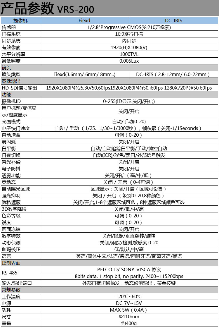 维尔斯VRS-200,HD-SDI高清宽动态星光级直播枪机 支持1080I 摄像机,广泛应用于安防,智能交通,医疗,视频会议等领域。