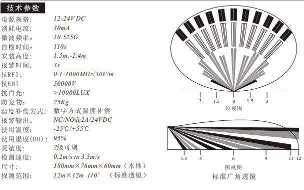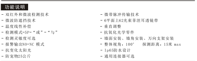 产品描述:这是一款先进的三技术(被动红外+被动红外+微波)室外用人体移动入侵探测器。依靠其先进的高位数字信号处理技术来处理3个传感器信号,具有超强的稳定性。能在2种敏感等级上有3种不同的检测模式,为给现场环境选择最好的检测方案,并在最佳的检测能力和最低的误报率之间得到最好的比率。探测器还有微波单独检测的智能5P模式。以避免涂料喷洒在镜头上带来损害。其独特的防水设计非常适合室外安装。同时,探测器也为安装用户提供NO/NC输出选择,克直接用于激活闭路电视系统以及门禁系统。