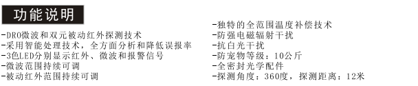产品描述:这是一款结合了红外和微波技术的吸顶双鉴人体移动探测器,它独特而又精准的球面透镜为红外传感器提供了一个木盖360度的探测器范围。三色LED可以很清晰的显示两种探测器结果,同事,探测器可以应用在室内多种场合,诸如仓库,酒店客房,办公室等。