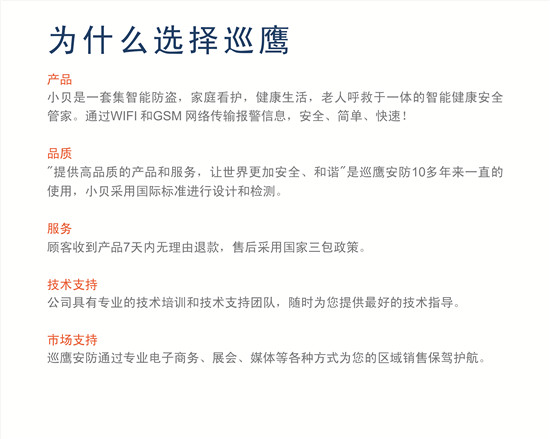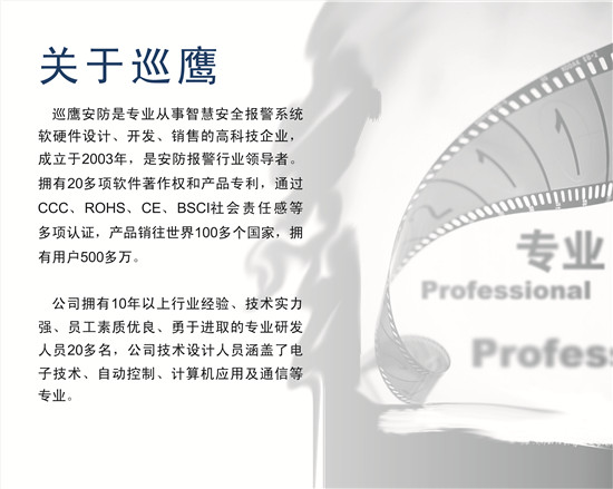 公司产品广泛应用于家庭、小区物业、电力、交通、石油、化工、煤炭、铁道、市政、公安等行业部门的安全装置、数据监测以及远程监控。巡鹰产品系列有:3G视频监控图像报警系统、GSM电力设备报警系统、GSM家用/商用报警系统、WiFi家用/商用报警系统、GSM工业报警系统、电话报警系统、智能家居控制报警系统、联网报警中心系统、及各类探测器等。